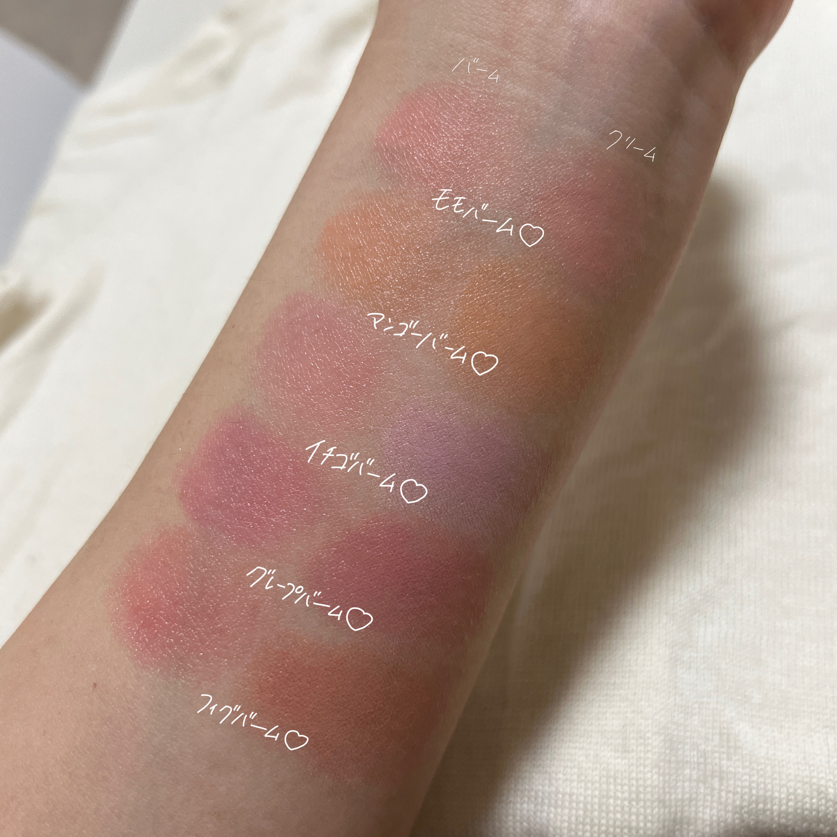 - <01 モモバーム> リンゴ酸ジイソステアリル、トリカプリル酸/カプリン酸グリセリド、トリイソステアリン酸ポリグリセリル-2、オクチルドデカノール、ジリノール酸硬化ヒマシ油ダイマー、ポリイソブテン、合成ワックス、マイクロクリスタリンワックス、イソステアリン酸ポリグリセリル-4、ジステアルジモニウムヘクトライト、セスキオレイン酸ソルビタン、カプリル酸/カプリン酸ソルビタン、グリセリド、炭酸プロピレン、水(アクア)、グリセリン、ブチレングリコール、マカダミア種子油、セラミドNP、モモ花エキス、フィトスフィンゴシン、アラビカコーヒー種子エキス、水添レシチン、加水分解エクステンシン、香料(パルファム)、リナロール、リモネン、ベンジルアルコール、二酸化チタン(CI 77891)、レッド28レーキ(CI 45410)、イエロー5レーキ(CI 19140)、酸化鉄(CI 77491)、酸化鉄(CI 77492)、イソノナン酸イソノニル、ポリアシルアジピン酸ビス-ジグリセリル、ジリノール酸フィトステリル/イソステアリル/セチル/ステアリル/ベヘニルダイマー、トリエチルヘキサノイン、マイカ、ジフェニルジメチコン、パラフィン、ナイロン12、シリカ、ケイ酸ジメチル、ユーフォルビア セリフェラ (キャンデリラ) ワックス、1,2-ヘキサンジオール、イソステアリン酸ソルビタン、酢酸トコフェロール、ジメチコン、マカダミア テルニフォリア種子油、サクラソウ(モモ)花エキス、水素化レシチン、レッド 6 (CI 15850)、レッド 7 レーキ (CI 15850)、イエロー 6 レーキ (CI 15985) <02 マンゴーバーム> リンゴ酸ジイソステアリル、トリカプリル酸/カプリン酸グリセリド、トリイソステアリン酸ポリグリセリル-2、オクチルドデカノール、ジリノール酸硬化ヒマシ油ダイマー、ポリイソブテン、合成ワックス、マイクロクリスタリンワックス、イソステアリン酸ポリグリセリル-4、ジステアルジモニウムヘクトライト、セスキオレイン酸ソルビタン、カプリル酸/カプリン酸グリセリド、水(アクア)、グリセリン、ブチレングリコール、マカダミア種子油、セラミドNP、モモ花エキス、フィトスフィンゴシン、アラビカコーヒー種子エキス、水添レシチン、加水分解エクステンシン、香料(パルファム)、リナロール、リモネン、ベンジルアルコール、二酸化チタン (CI 77891)、イエロー 6 レーキ (CI 15985)、炭酸プロピレン、イエロー 5 レーキ (CI 19140)、レッド 28 レーキ (CI 45410)、酸化鉄 (CI 77492)、酸化鉄 (CI 77491)、レッド7 レーキ (CI 15850)、イソノナン酸イソノニル、ポリアシルアジピン酸ビス-ジグリセリル、ジリノール酸フィトステリル/イソステアリル/セチル/ステアリル/ベヘニルダイマー、トリエチルヘキサノイン、マイカ、ジフェニルジメチコン、パラフィン、ナイロン12、シリカ、ケイ酸ジメチル、ユーフォルビア セリフェラ (キャンデリラ) ワックス、1,2-ヘキサンジオール、イソステアリン酸ソルビタン、酢酸トコフェロール、ジメチコン、マカダミア テルニフォリア種子油、サクラソウ(モモ)花エキス、水素化レシチン、レッド 6 (CI 15850) <03 イチゴバーム> リンゴ酸ジイソステアリル、トリカプリル酸/カプリン酸グリセリド、トリイソステアリン酸ポリグリセリル-2、オクチルドデカノール、ジリノール酸硬化ヒマシ油ダイマー、ポリイソブテン、合成ワックス、マイクロクリスタリンワックス、イソステアリン酸ポリグリセリル-4、ジステアルジモニウムヘクトライト、セスキオレイン酸ソルビタン、カプリル酸/カプリン酸グリセリド、プロピレン炭酸、香料(パルファム)、水(アクア)、グリセリン、ブチレングリコール、マカダミア種子油、セラミドNP、サクラ(モモ)花エキス、フィトスフィンゴシン、アラビカコーヒー(コーヒー)種子エキス、水添レシチン、加水分解エクステンシン、香料(パルファム) )、リナロール、リモネン、ベンジルアルコール、二酸化チタン (CI 77891)、レッド 28 レーキ (CI 45410)、酸化鉄 (CI 77492)、レッド 7 レーキ (CI 15850)、イエロー 6 レーキ (CI 15985)、酸化鉄 (CI 77491)、イソノナン酸イソノニル、ポリアシルアジピン酸ビス-ジグリセリル、ジリノール酸フィトステリル/イソステアリル/セチル/ステアリル/ベヘニルダイマー、トリエチルヘキサノイン、マイカ、ジフェニルジメチコン、パラフィン、ナイロン12、シリカ、ケイ酸ジメチル、ユーフォルビア セリフェラ (キャンデリラ) ワックス、1,2-ヘキサンジオール、イソステアリン酸ソルビタン、酢酸トコフェロール、ジメチコン、マカダミア テルニフォリア種子油、水素化レシチン、ブルー 1 レーキ(CI 42090)、イエロー 5 レーキ (CI 19140) <04 グレープバーム> リンゴ酸ジイソステアリル、トリカプリル酸/カプリン酸グリセリド、トリイソステアリン酸ポリグリセリル-2、オクチルドデカノール、ジリノール酸硬化ヒマシ油ダイマー、ポリイソブテン、合成ワックス、マイクロクリスタリンワックス、イソステアリン酸ポリグリセリル-4、ジステアルジモニウムヘクトライト、セスキオレイン酸