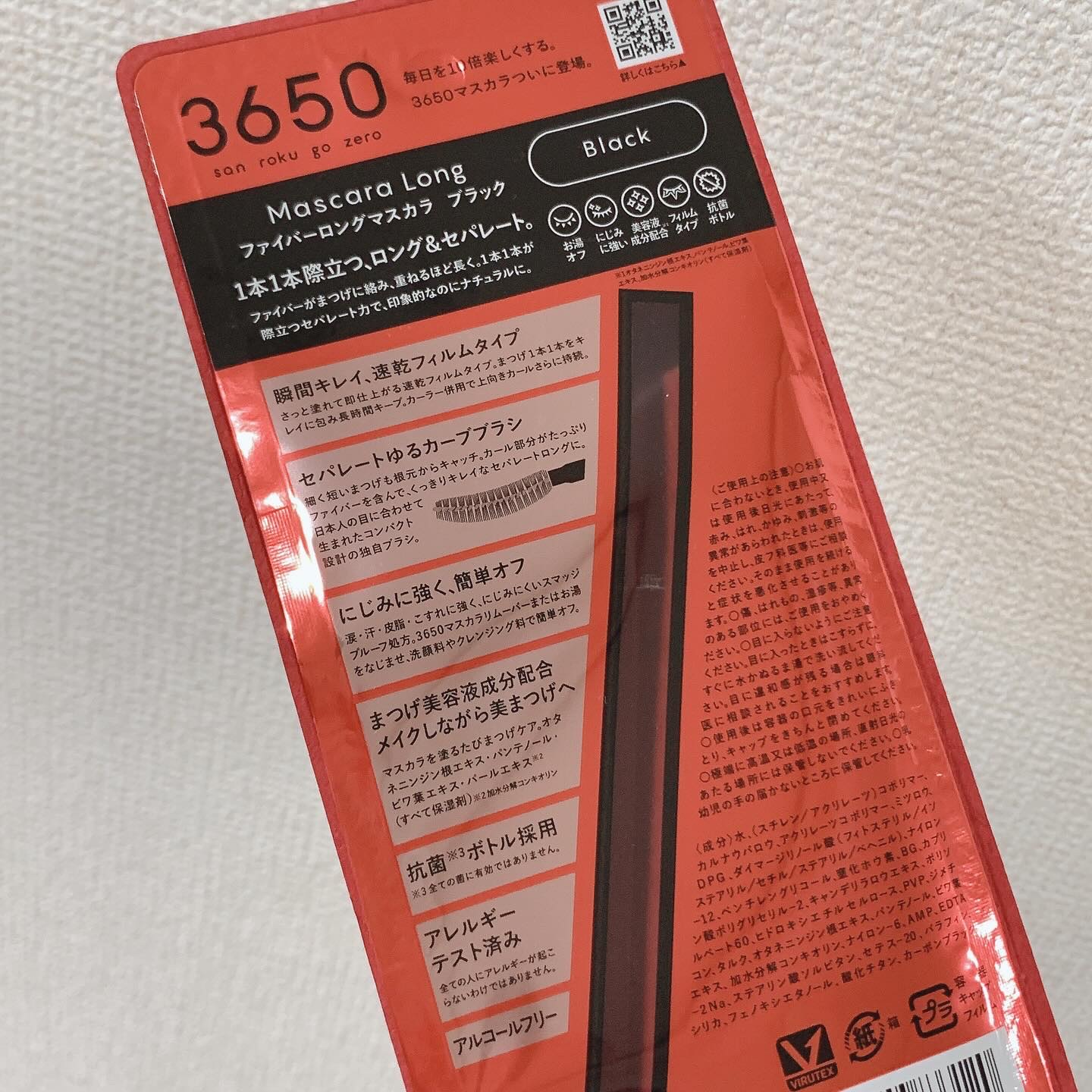 - 1本1本際立つ、ロング&セパレート。 ファイバーがまつげに絡み、重ねるほど長く。1本1本が際立つセパレート力で、印象的なのにナチュラルに。 【瞬間キレイ、速乾フィルムタイプ】 さっと塗れて即仕上がる速乾フィルムタイプ。まつげ1本1本をキレイに包み長時間キープ。上向きカール持続。 【セパレートゆるカーブブラシ】 細く短いまつげも根元からキャッチ。カール部分がたっぷりファイバーを含んで、くっきりキレイなセパレートロングに。 日本人の目に合わせて生まれたコンパクト設計の独自ブラシ。 【にじみに強く、簡単オフ】 涙・汗・皮脂・こすれに強く、にじみにくいスマッジプルーフ処方。3650マスカラリムーバまたはお湯をなじませ、洗顔料やクレンジング料でオフ。 【まつげ美容液成分配合メイクしながら美まつげへ】 マスカラを塗るたびまつげケア。オタネニンジン根エキス・パンテノール・ビワ葉エキス・パールエキス*1(全て保湿剤) 【抗菌*2ボトル採用】 【アレルギーテスト済み】 全ての人にアレルギーが起こらないわけではありません。 【アルコールフリー】 *1 加水分解コンキオリン *2 全ての菌に有効ではありません。