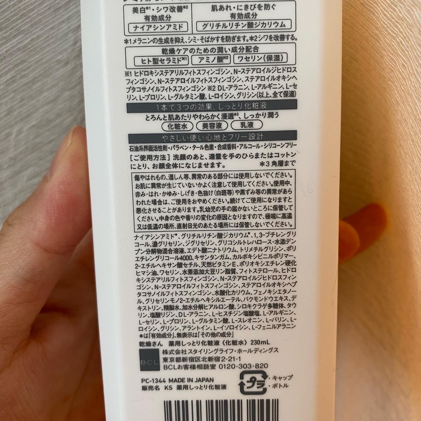 - <乾燥さん 薬用しっとり化粧液【医薬部外品】> ナイアシンアミド、グリチルリチン酸ジカリウム、1,3–ブチレングリコール、濃グリセリン、ジグリセリン、グリコシルトレハロース・水添デンプン分解物混合溶液、エデト酸二ナトリウム、トリメチルグリシン、ポリエチレングリコール4000、キサンタンガム、カルボキシビニルポリマー、2–エチルヘキサン酸セチル、天然ビタミンE、ポリオキシエチレン硬化ヒマシ油、ワセリン、水素添加大豆リン脂質、フィトステロール、ヒドロキシステアリルフィトスフィンゴシン、N–ステアロイルジヒドロスフィンゴシン、N–ステアロイルフィトスフィンゴシン、ステアロイルオキシヘプタコサノイルフィトスフィンゴシン、水酸化カリウム、フェノキシエタノール、グリセリンモノ2–エチルヘキシルエーテル、バクモンドウエキス、デキストリン、精製水、加水分解ヒアルロン酸、シロキクラゲ多糖体、タウリン、塩酸リジン、DL–アラニン、L–ヒスチジン塩酸塩、L–アルギニン、L–セリン、L–プロリン、L–グルタミン酸、L–スレオニン、L–バリン、L–ロイシン、グリシン、アラントイン、L–イソロイシン、L–フェニルアラニン <乾燥さん 薬用しっとり化粧液 つめ替用> ナイアシンアミド、グリチルリチン酸ジカリウム、1,3–ブチレングリコール、濃グリセリン、ジグリセリン、グリコシルトレハロース・水添デンプン分解物混合溶液、エデト酸二ナトリウム、トリメチルグリシン、ポリエチレングリコール4000、キサンタンガム、カルボキシビニルポリマー、2–エチルヘキサン酸セチル、天然ビタミンE、ポリオキシエチレン硬化ヒマシ油、ワセリン、水素添加大豆リン脂質、フィトステロール、ヒドロキシステアリルフィトスフィンゴシン、N–ステアロイルジヒドロスフィンゴシン、N–ステアロイルフィトスフィンゴシン、ステアロイルオキシヘプタコサノイルフィトスフィンゴシン、水酸化カリウム、フェノキシエタノール、グリセリンモノ2–エチルヘキシルエーテル、バクモンドウエキス、デキストリン、精製水、加水分解ヒアルロン酸、シロキクラゲ多糖体、タウリン、塩酸リジン、DL–アラニン、L–ヒスチジン塩酸塩、L–アルギニン、L–セリン、L–プロリン、L–グルタミン酸、L–スレオニン、L–バリン、L–ロイシン、グリシン、アラントイン、L–イソロイシン、L–フェニルアラニン <乾燥さん 薬用しっとり化粧液 つめ替用 限定デザインボトルキット> ナイアシンアミド、グリチルリチン酸ジカリウム、1,3–ブチレングリコール、濃グリセリン、ジグリセリン、グリコシルトレハロース・水添デンプン分解物混合溶液、エデト酸二ナトリウム、トリメチルグリシン、ポリエチレングリコール4000、キサンタンガム、カルボキシビニルポリマー、2–エチルヘキサン酸セチル、天然ビタミンE、ポリオキシエチレン硬化ヒマシ油、ワセリン、水素添加大豆リン脂質、フィトステロール、ヒドロキシステアリルフィトスフィンゴシン、N–ステアロイルジヒドロスフィンゴシン、N–ステアロイルフィトスフィンゴシン、ステアロイルオキシヘプタコサノイルフィトスフィンゴシン、水酸化カリウム、フェノキシエタノール、グリセリンモノ2–エチルヘキシルエーテル、バクモンドウエキス、デキストリン、精製水、加水分解ヒアルロン酸、シロキクラゲ多糖体、タウリン、塩酸リジン、DL–アラニン、L–ヒスチジン塩酸塩、L–アルギニン、L–セリン、L–プロリン、L–グルタミン酸、L–スレオニン、L–バリン、L–ロイシン、グリシン、アラントイン、L–イソロイシン、L–フェニルアラニン