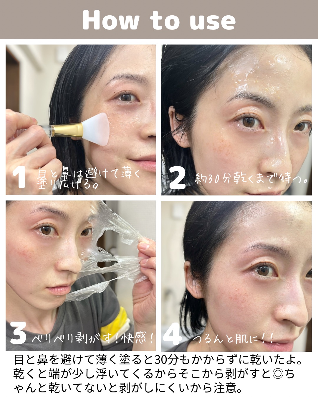 テクスチャーはトロトロしていて伸びが良いよ。 時間が経つにつれてマスクが固まってきて、まるで石化した気分に🤣笑 剥がすときは基本綺麗に剥がれるけど、髪の毛に付くと大変かも。 使用後の肌はワントーンアップした気がしたし、ザラつきもなくなったような🥰