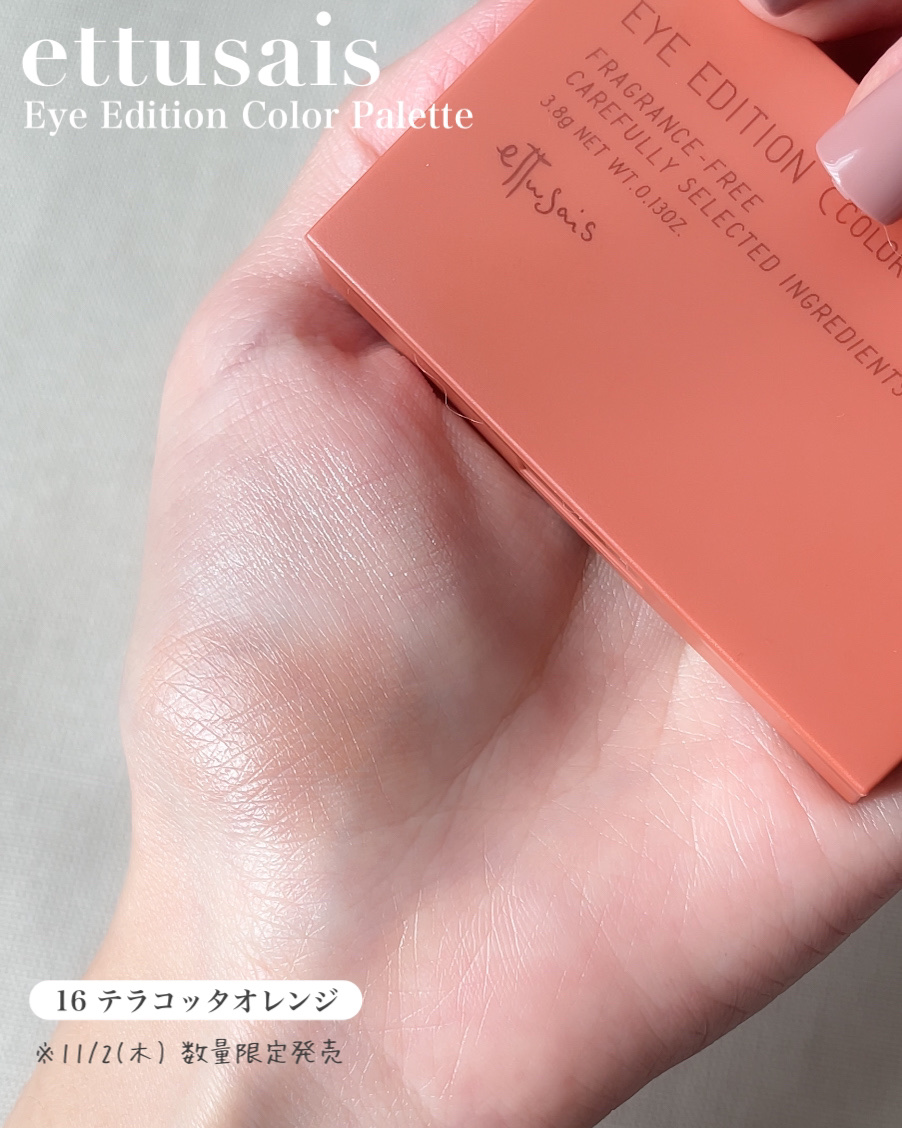 - 2つの質感で、 目もとに深みを演出する デュオアイシャドウ ●ツヤとマットの2つの質感で、肌になじみながらも目もとをナチュラルに大きく仕上げる。 ーなめらかなツヤを放つ「シルクカラー」と、ぬくもりのあるマットな「カシミヤカラー」の2種をセット。 ー肌なじみのよいゴールドパール配合 ●しっとりなめらかなパウダーがまぶたにフィットし、しっかり発色。 ●トリートメント成分配合 ースクワラン、ホホバ油 ●無香料 ●つけたての美しい仕上がりが長時間持続。(※22・23を除く) ●アレルギーテスト済み(すべての方にアレルギーが起きないというわけではありません)(※22・23を除く) <使い方> ●指またはお手持ちのチップをお使いください。 ●シルクカラーをアイホール全体に、カシミヤカラーをまつ毛の生えぎわからぼかすようになじませます。 <使用上の注意> ●目に入らないようにご注意ください。もし、入った場合は、こすらずにすぐに水かぬるま湯で洗い流してください。 ●落下などの衝撃により、割れることがありますのでご注意ください。 ●日のあたるところや高温・多湿のところにおかないでください。 ※07~21 販売名 : エテュセ アイエディション (カラーパレット) N 22~23 販売名 : エテュセ アイエディション (カラーパレット) a