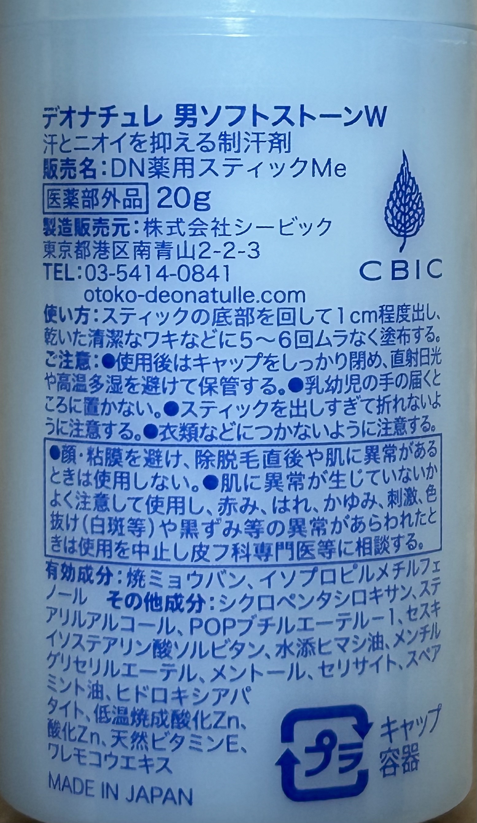 - \7年連続売上No.1*制汗デオドラント/ 『男の汗とニオイに効く!!防臭力の男デオナチュレ』シリーズでも、一番人気の「薬用デオナチュレ 男ソフトストーンW」 ◆◆商品特長◆◆ ◆有効成分『焼ミョウバン』がニオイを元から防ぎ、汗を抑える ◆ベタつき防止成分配合でさらさら快適(**、***) ◆有効成分イソプロピルメチルフェノール配合。ニオイの原因菌を殺菌 ◆男のワキに“直ヌリ”で成分がしっかり密着し、朝ぬって夜まで続く! ◆ぬった後は、乾かす手間が不要!サラサラ! ベタつき・白残りしにくい ==注意== ●顔・粘膜を避け、除脱毛直後や肌に異常があるときは使用しない●肌に異常が生じていないかよく注意して使用し、赤み、はれ、かゆみ、刺激、色抜け(白斑等)や黒ずみ等の異常があらわれたときは使用を中止し皮フ科専門医等に相談する。●使用後はキャップをしっかり閉め、直射日光や高温多湿を避けて保管する。●乳幼児の手の届くところに置かない。●スティックを出しすぎて折れないように注意する。●衣類などにつかないように注意する。●本製品は残り少なくなりますと、構造上容器の底に中身が若干残ります。そのため、実際には容器に表記されている容量以上を充填しております。 販売名:DN薬用スティックMe *インテージ SRI+ 男性制汗剤市場 2017年5月~2024年4月 男ソフトストーンW(販売名:DN薬用デオドラントスティックMc(リニューアル前処方)・DN薬用スティックMe)累計販売金額 **基剤:低温焼成酸化Zn ***基剤:酸化Zn