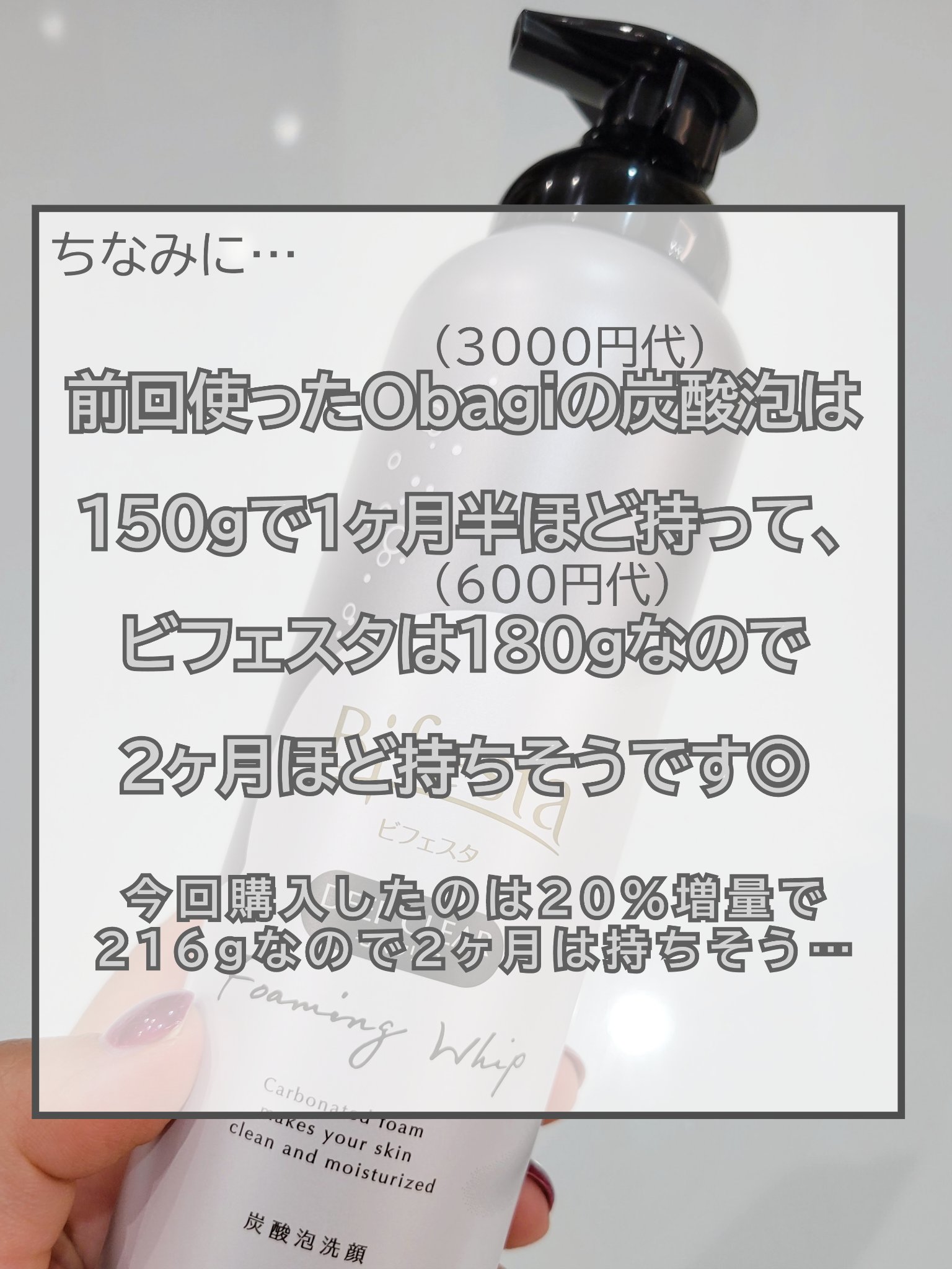- 4,000万個※1の毛穴よりも小さいミクロの炭酸※2泡で毛穴汚れもこすらず吸着洗浄。 アミノ酸系洗浄成分配合の濃密泡で毛穴汚れをしっかり落とし、肌をいたわりながらしっとり洗い上げます。 吸着成分の炭とクレイ※3配合。 毛穴詰まりもつるんとオフしてなめらかなすべすべ肌に導きます。 ビフェスタ泡洗顔シリーズで最も洗浄力が高く、さっぱりとした洗い上がりです。 香料フリー、合成着色剤フリー、アルコールフリー(エタノール無添加)、パラベンフリー、パッチテスト済み※4。 ※1 1回あたりの使用量を目安に算出 ※2 炭酸ガス(噴射剤) ※3 ベントナイト ※4 全ての方に皮膚刺激が起こらないわけではありません。 ※2024年8月下旬よりパッケージを変更し、容量を200gに増量します。