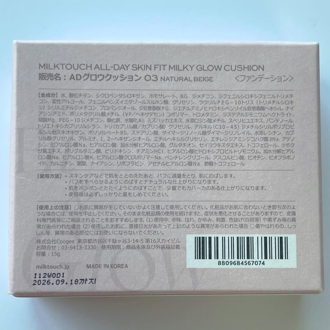 Milk Touch オールデイスキンフィットミルキーグロウクッション | 2,970円 |