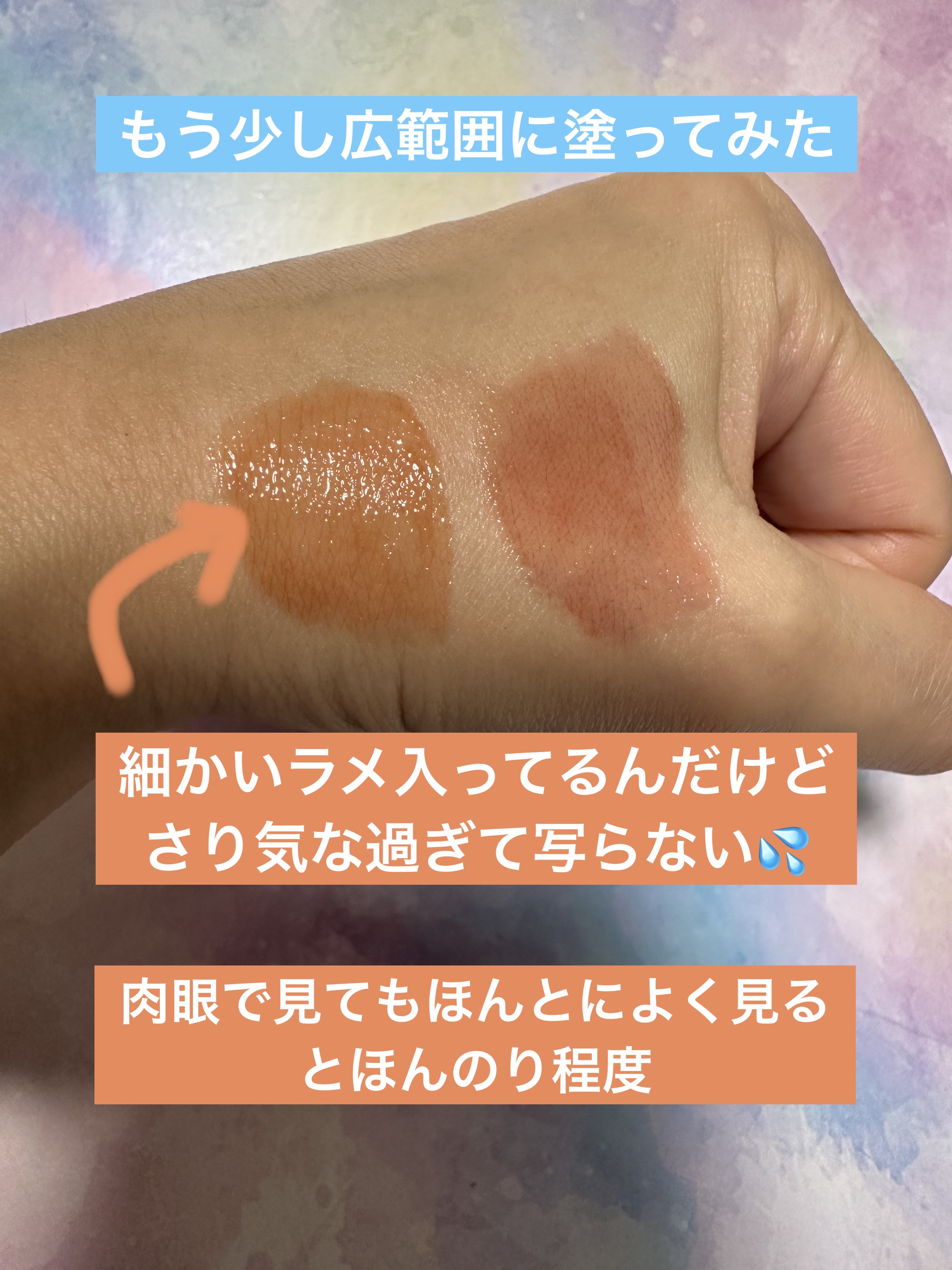 塗りムラできて難し過ぎました。私の技術力だと綺麗に見せるには厚めに2度塗りか薄めに3度塗りで調節しなきゃです。重ねると紫と濃い茶色の間のようにな色に見えます。ハロウィン感あるかも!ラメはよく見ると中でチラチラしてるなー程度、控えめです。...