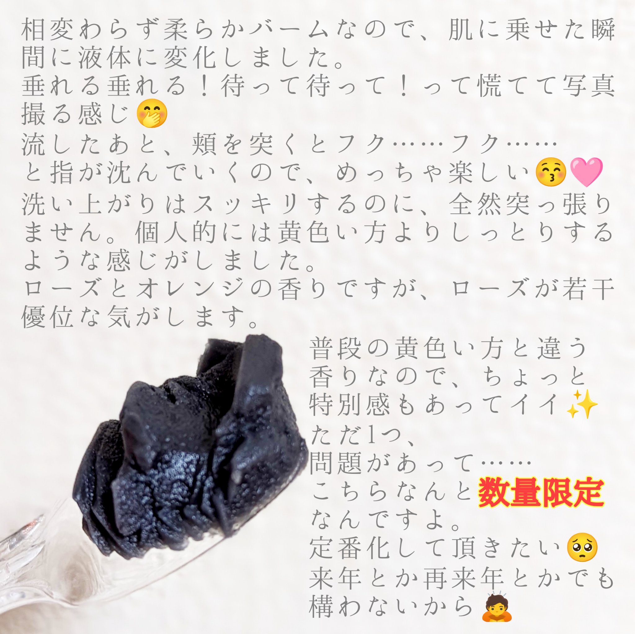 | スキンケアランキング第119位 | バームが取ってみるとじんわりととろけてきて、なめらかなテクスチャーに!馴染ませやすくて使いやすいです。 | 詳細を見る | |