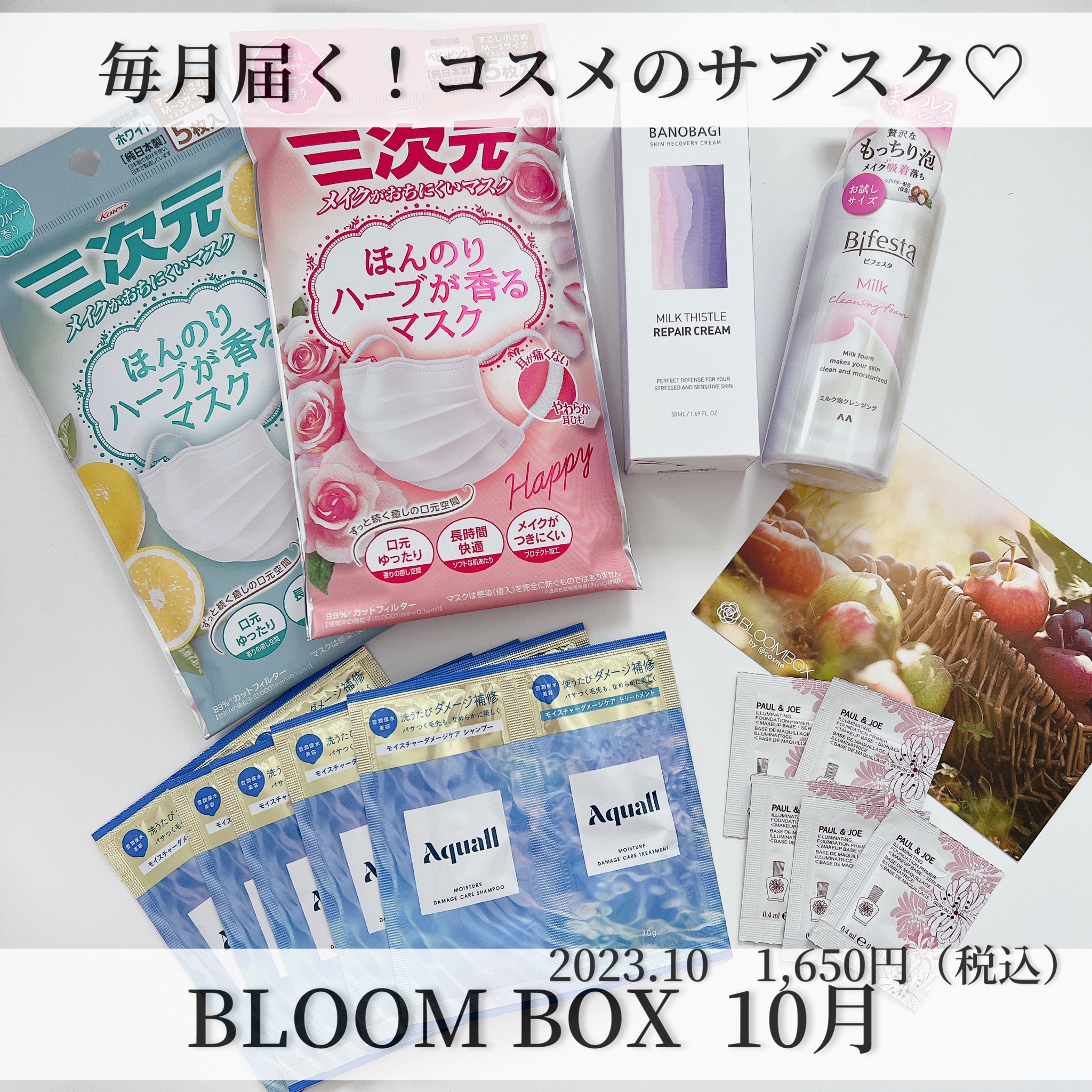 -     ✯BLOOM BOX @at_cosme   2022.10月ボックス🕊   月 1,650円 ━━━━━━━━━━━━━━━━━━━ 毎月1,650円で届くコスメのサブスク🫧    ◆バノバギ ミルクシスルリペアクリーム 50ml 3,040円 ◆3次元マスク ほんのりハーブが香るマスク 2種類 ---円 ◆ビフェスタ ミルク泡クレンジング サンプル ---円 ◆その他サンプル ---円 ━━━━━━━━━━━━━━━━━━━