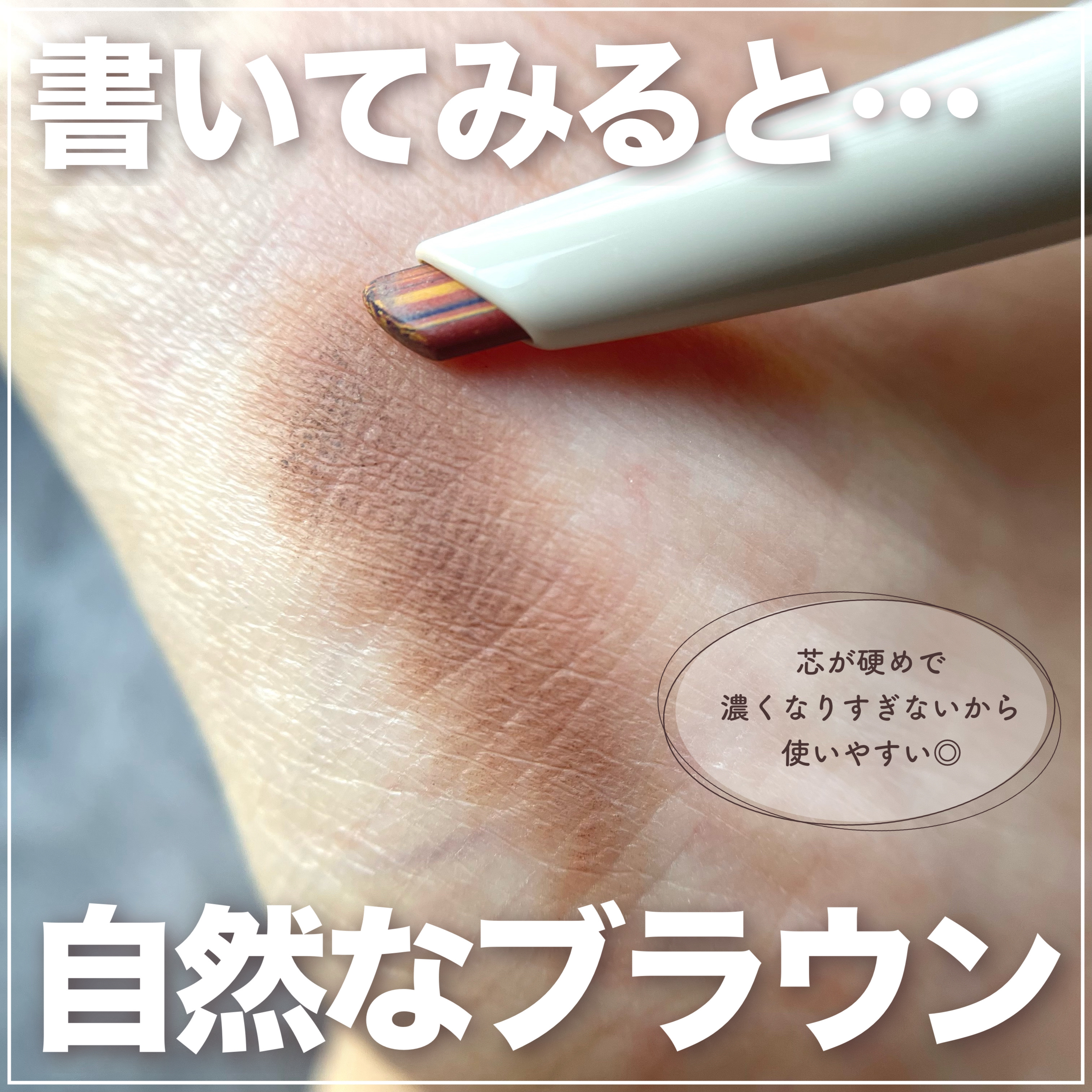 - ◆黄・赤・青の3色からなる多色な芯で、ペンシルでありながら立体感のあるあか抜け眉を演出 黒の顔料を使用せず、黄・赤・青の3色を混ぜ合わせ自然な眉色を表現。 多色で芯を構成するため、様々な眉色や髪色にもしっくりなじむ。ニュートラルなブラウンカラー。 ◆涙型の芯先形状で、面でも線でも描きやすい テクニックいらずで、広い面も細い箇所も描きやすい涙型の芯先形状。 ふんわり立体感がありながらも、眉尻などの細かい箇所はシャープで締まった印象へ。 ◆密着感があり、仕上がりが長持ち。化粧もち成分配合 肌や眉毛に密着し、汗・皮脂に強い粉体配合でくずれにくい処方設計。 ウォータープルーフ処方を採用。