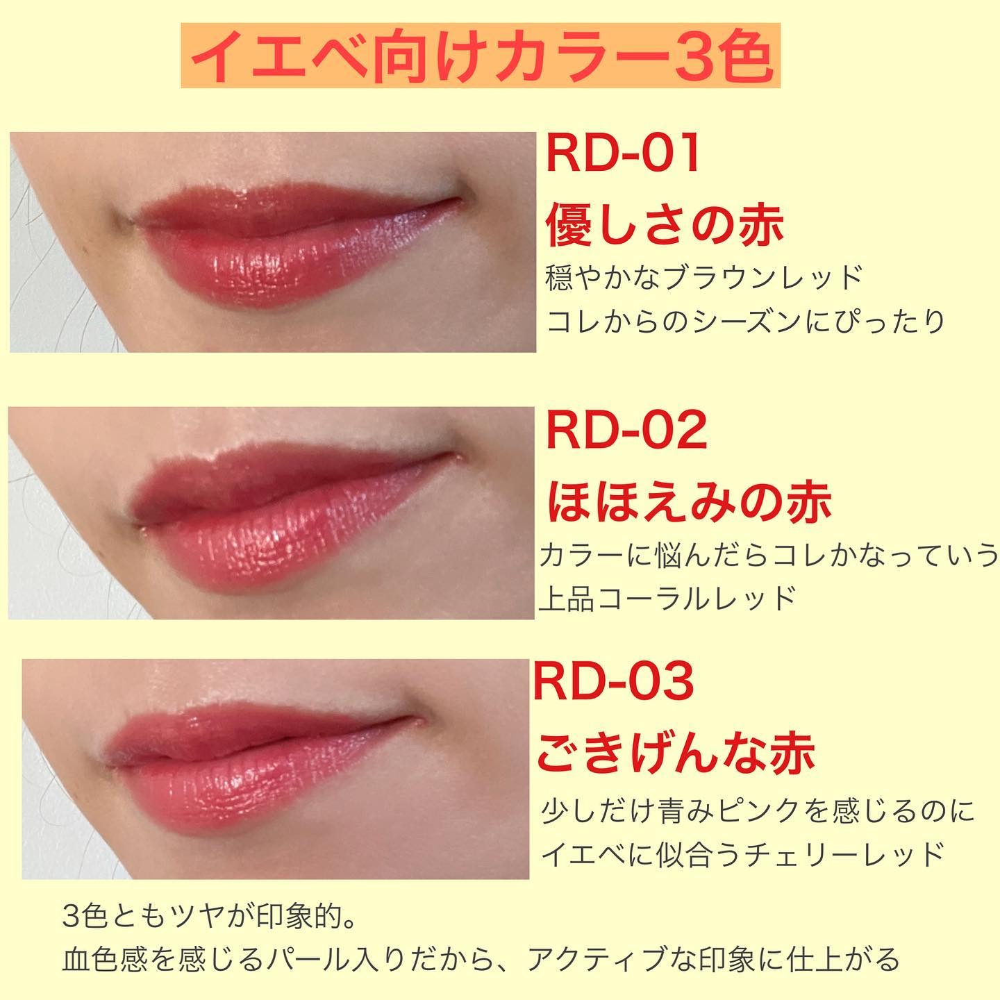 - ひと塗りで、うるおい満ちる血色感。 透け感のある赤が、表情まで明るくつややかに。 1. 美しい発色 赤顔料に加えて「血色パール」を配合することでより赤が美しく発色する。 2. 透明感と軽やかさ 血色パールにより、顔料を多く配合しなくても赤がきれいに洗わせるので、油剤のツヤ感効果も出て、透明感のある仕上がりに。 3. 優しい血色感が続く 唇を優しく色づける染料と色残りの良い板状の「血色パール」で経時でも蛍光色にならず、優しい血色感が続く。