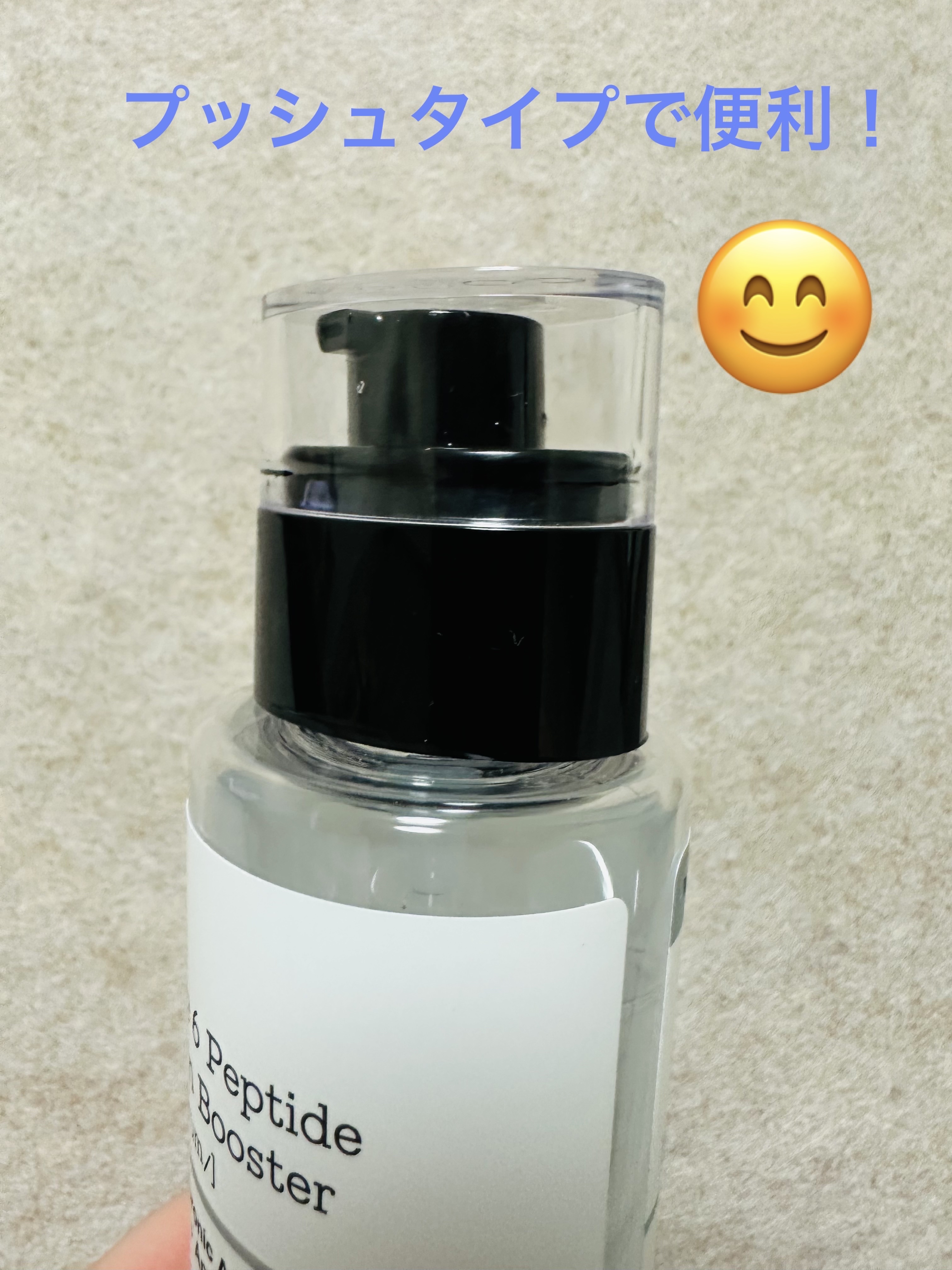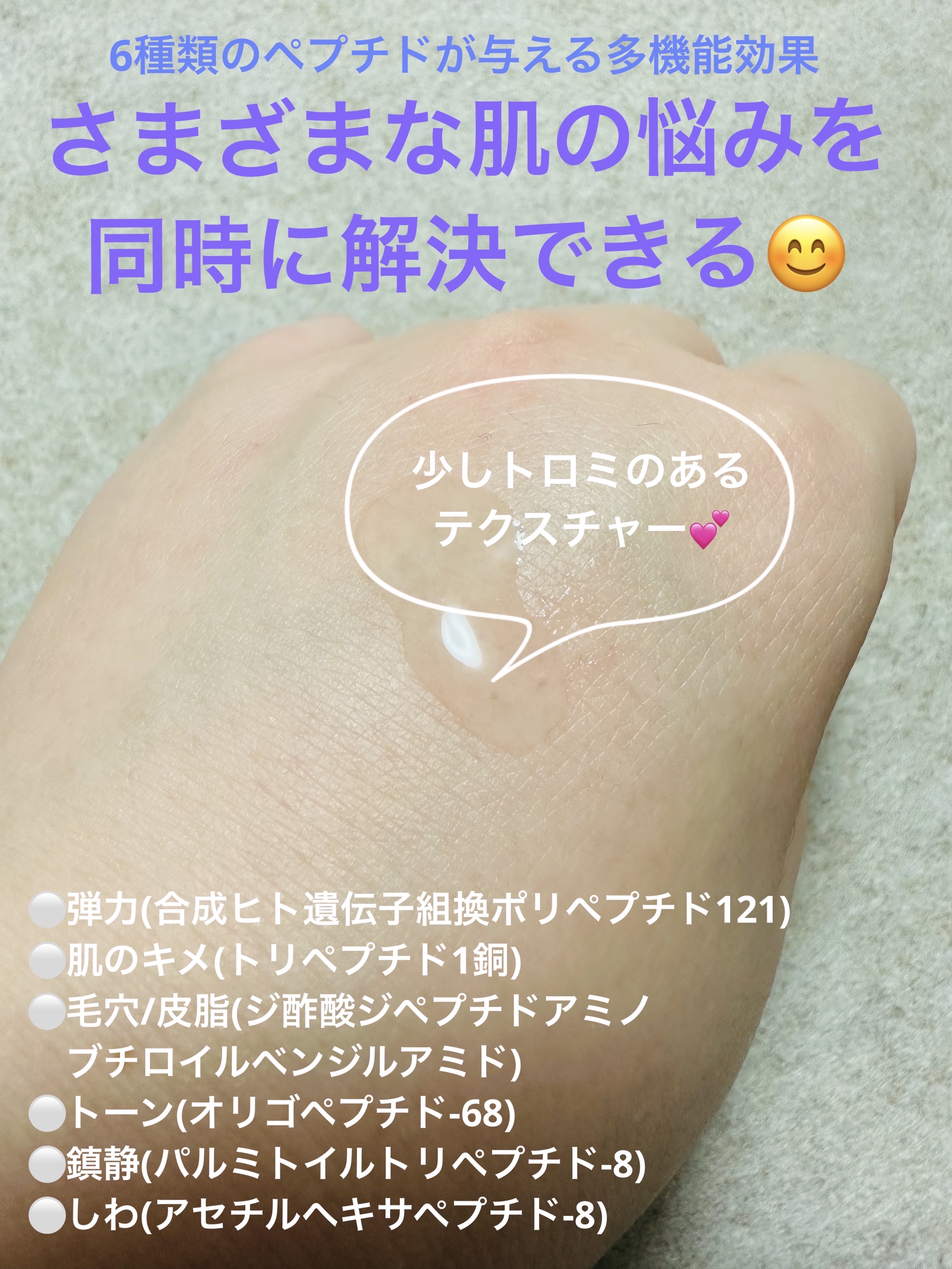 6種類のペプチド入りのブースター (導入美容液)なんだけど、スキンケアの一番最初に使うことで、次に使用する美容液やクリームの効果をアップしてくれるお助けアイテムなの🤩 さらっとしているのに少しとろみがあるように感じるテクスチャー。べたつかず、しっとりとした仕上がり。 保湿力があるから、これを使うと朝のお肌がふっくらする気がしてる!メイク前に使ってもモロモロしないし、シンプルに使いやすい✨