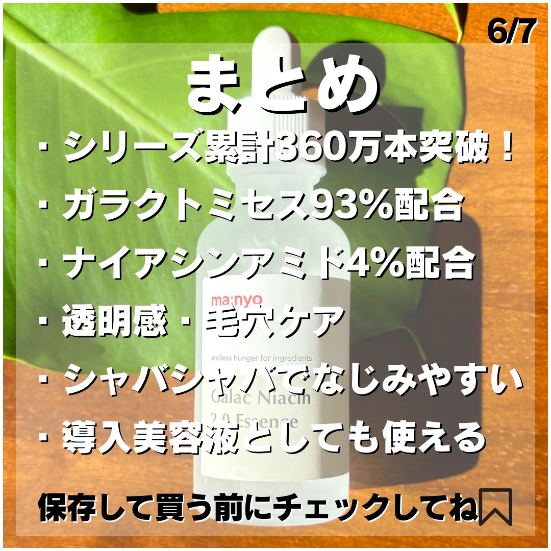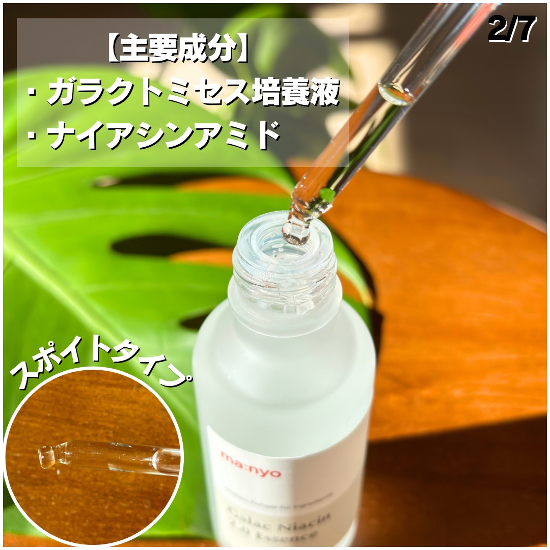 - ビタミン、アミノ酸などの有効成分を豊富に含んだガラクトミセスが93%配合され、皮脂・水分バランスの調節、毛穴ケア、トーンアップケアをサポート。ナイアシンアミド4%配合でメラニンの生成を防ぐ濃縮美容液です。水のような軽いテクスチャーでべたつきません。愛用者からは「2週間で肌の変化を実感した」との声が多く届いています。