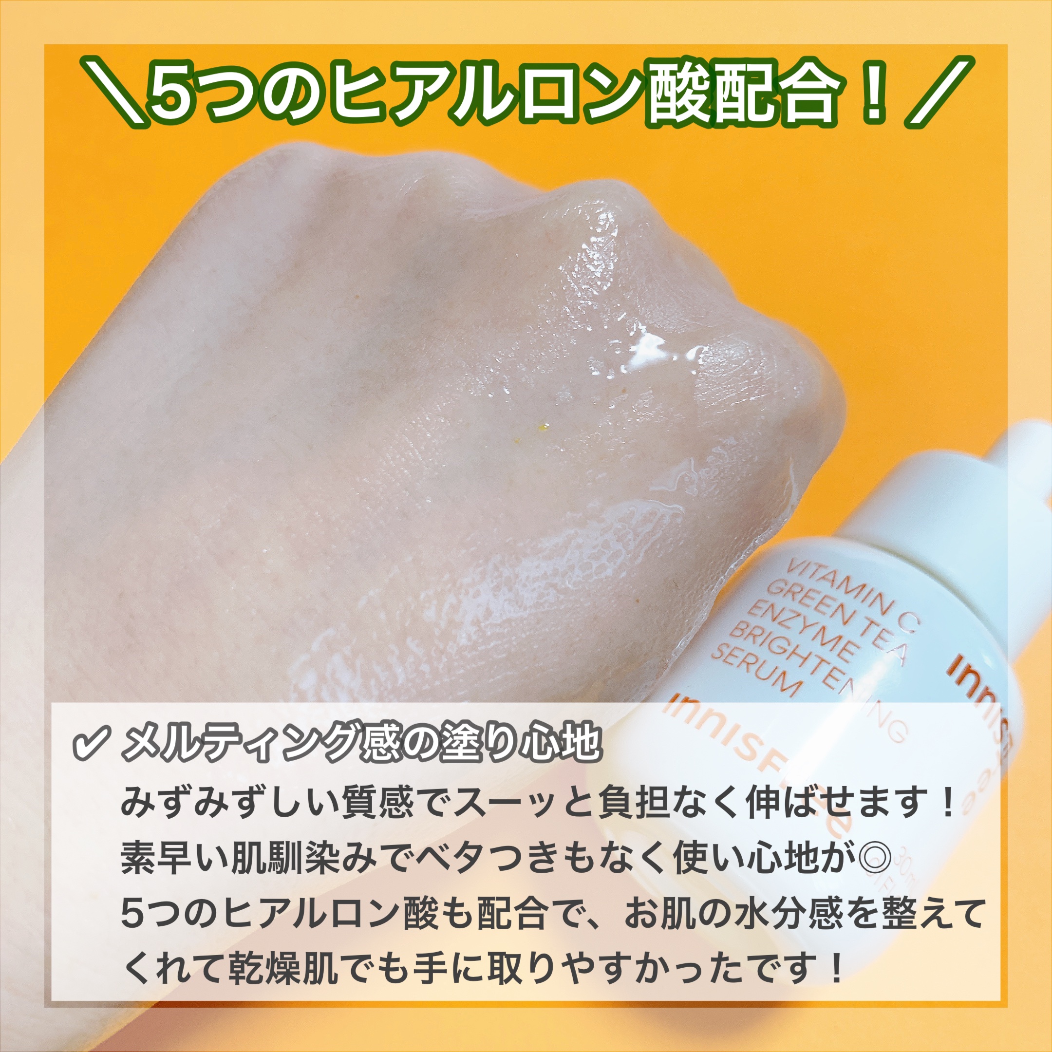 デュアルビタミンC誘導体×グリーンティーエンザイム配合の美容液です。innisfree独自のオイルドロップ処方で、水溶性・油溶性の2種類のビタミンC誘導体の配合を実現👏 やわらかめのジェルのようなテクスチャーで伸びが良く、オレンジ色のカプセルが入っています。肌馴染みも良く、肌に馴染ませた後はベタつきなくもっちりした仕上がりで朝にも使いやすい使用感かと思います! 秋は夏の紫外線などで角質ケアが必要な時期…そんな時にピッタリのビタミンC美容液です!