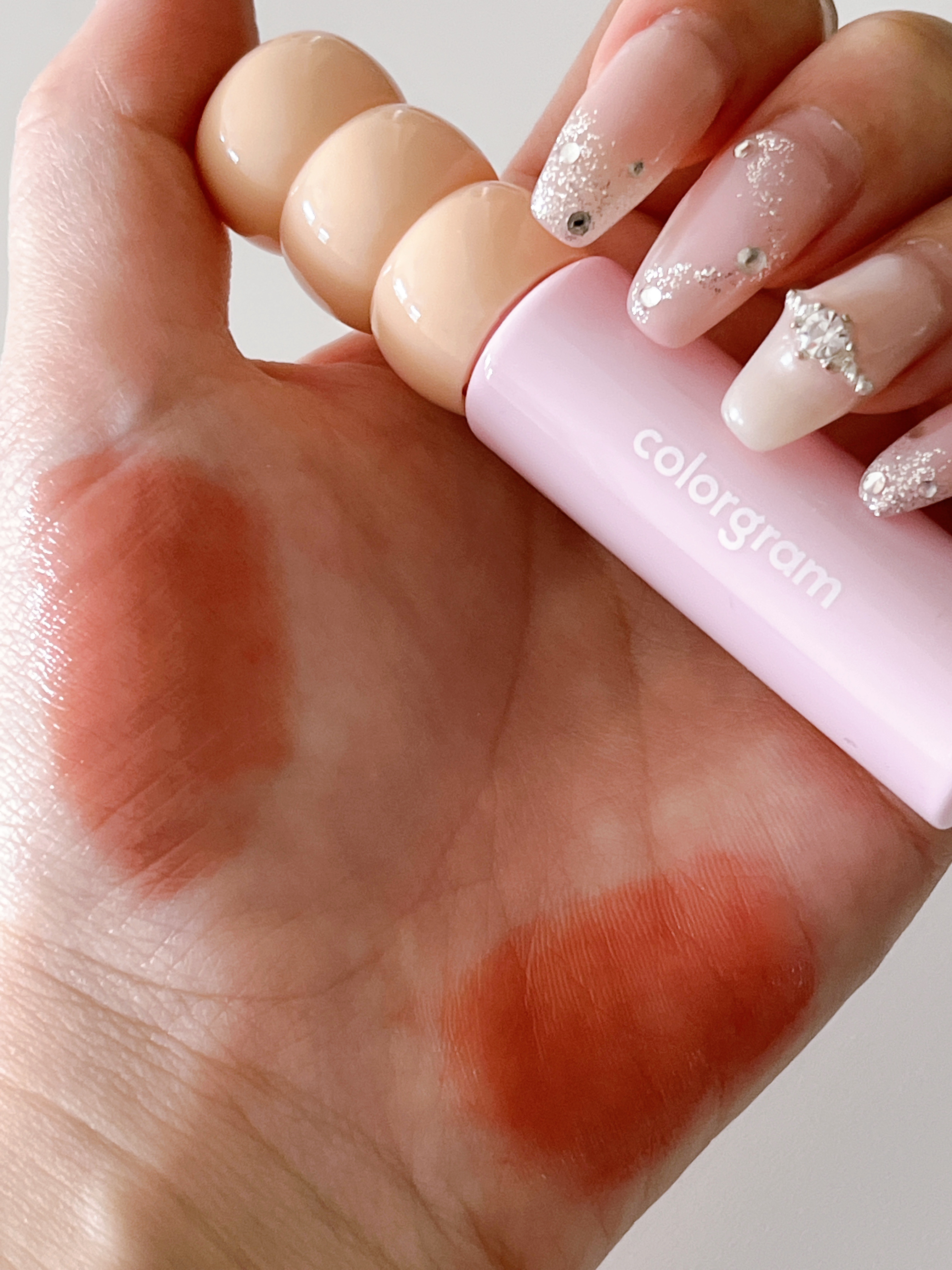 見た目もかわいい カラーグラムのティント🌼💗 うねうねころころした容器がかわいい💗 色もちも良くて、ティッシュオフしても長時間経っても発色もツヤ感もキープされててすごい✨ 05 スイートパーシモンは血色感のあるコーラルベージュカラー🍑 ブルベの私にも肌なじみが良く、顔色が明るくなる😌