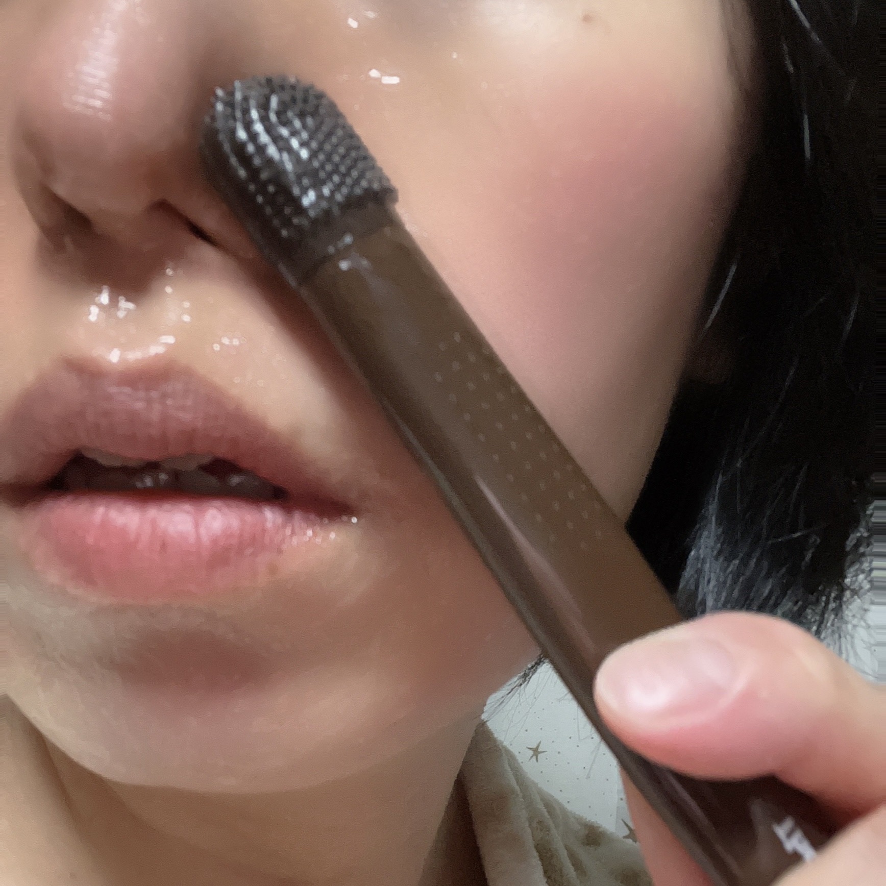 まずは温感ジェルを塗って 専用ブラシでクルクル👃🏻 温感ジェルは粘土が高く肌にしっかり 密着してくれる感じあり😳 ブラシは程よい硬さで小鼻にフィットする 形になっているので使いやすかった! 個人的に小鼻のザラつきには めちゃくちゃ良かったです😂♥️ 黒ずみは使い続ければ効果でそう! 仕上げに美容液を塗って完了だから とにかく簡単だった👌🏻 この美容液ビタミンC誘導体が 配合されてて、肌の引き締めケアも してくれます!🌟 ピーリングって乾燥や突っ張りを 結構感じてしまうので...💦 これなら使いやすくて毛穴ケアに 効果的だと思いました☺️💞 私は敏感肌ですがトラブルなく使えたよ◎