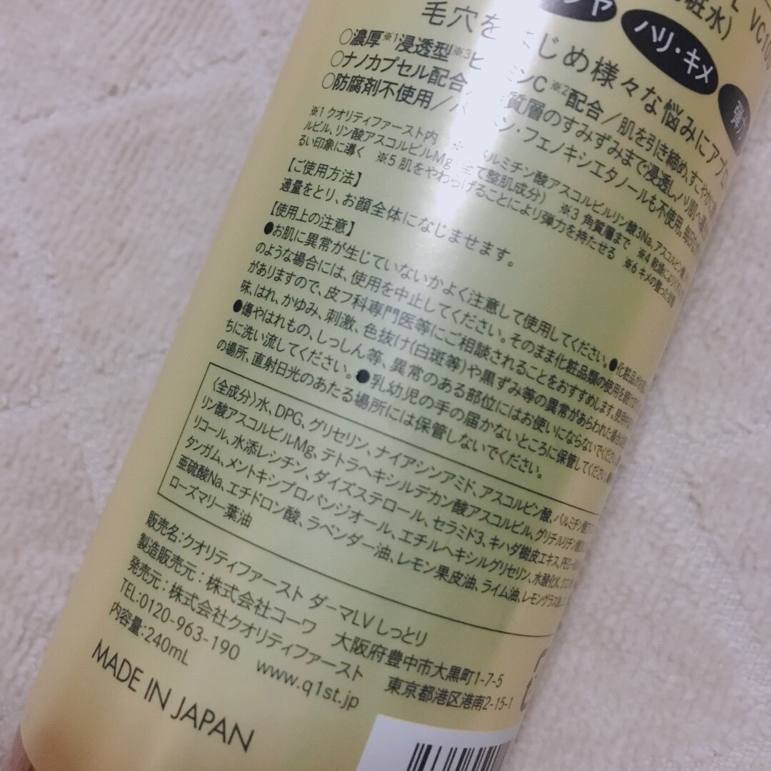 - <240ml> 水、DPG、グリセリン、ナイアシンアミド、アスコルビン酸、BG、グリチルリチン酸2K、トリプロピレングリコール、パルミチン酸アスコルビルリン酸3Na、テトラヘキシルデカン酸アスコルビル、リン酸アスコルビルMg、水添レシチン、ダイズステロール、セラミド3、キハダ樹皮エキス、PEG-60水添ヒマシ油、キサンタンガム、エチルヘキシルグリセリン、水酸化K、クエン酸、クエン酸Na、エチドロン酸、ラベンダー油、レモン果皮油、ライム油、レモングラス油、エンピツビャクシン油、ローズマリー葉油 <240ml 【旧品】> 水、DPG、グリセリン、ナイアシンアミド、アスコルビン酸、パルミチン酸アスコルビルリン酸3Na、リン酸アスコルビルMg、テトラヘキシルデカン酸アスコルビル、グリチルリチン酸2K、BG、トリプロピレングリコール、水添レシチン、ダイズステロール、セラミド3、キハダ樹皮エキス、PEG-60水添ヒマシ油、キサンタンガム、メントキシプロパンジオール、エチルヘキシルグリセリン、水酸化K、クエン酸、クエン酸Na、ピロ亜硫酸Na、エチドロン酸、ラベンダー油、レモン果皮油、ライム油、レモングラス油、エンピツビャクシン油、ローズマリー葉油