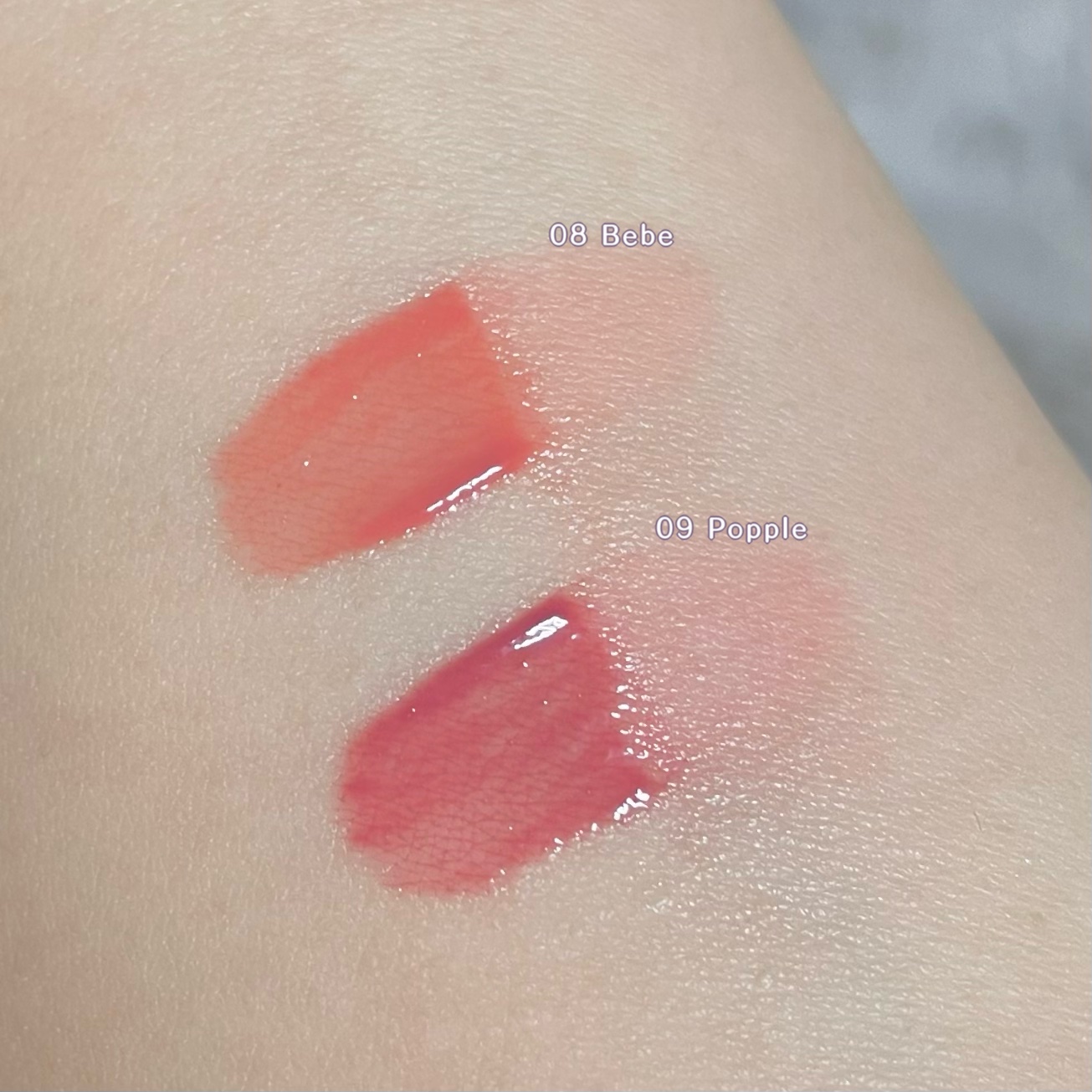 ⚫︎もっちりした液だけどつけ心地が軽くて、ベタベタくっついたりしない。 ⚫︎仕上がりはふっくらうるうる透明感抜群な仕上がりだけど、元の唇の色を透かしても、覆ってもかわいく使える💕 重ね塗り具合でツヤ感を変えられるのも楽しい✨ ⚫︎うるおいがあって唇が荒れにくい! 私の場合、むしろ唇の調子良くなりました。 ⚫︎色落ちの仕方がキレイ。 ティントの効果がムラなく発揮されていて、食事後もツヤは減るけど色ムラのできない落ち方で、元の唇の色がキレイな感じになる。ツヤ感も完全には消えない気がする。 ⚫︎パッケージがかわいくてテンション上がる✨✨ ⚫︎もけもけチップ+斜めカットだからキワまで塗りやすい!!