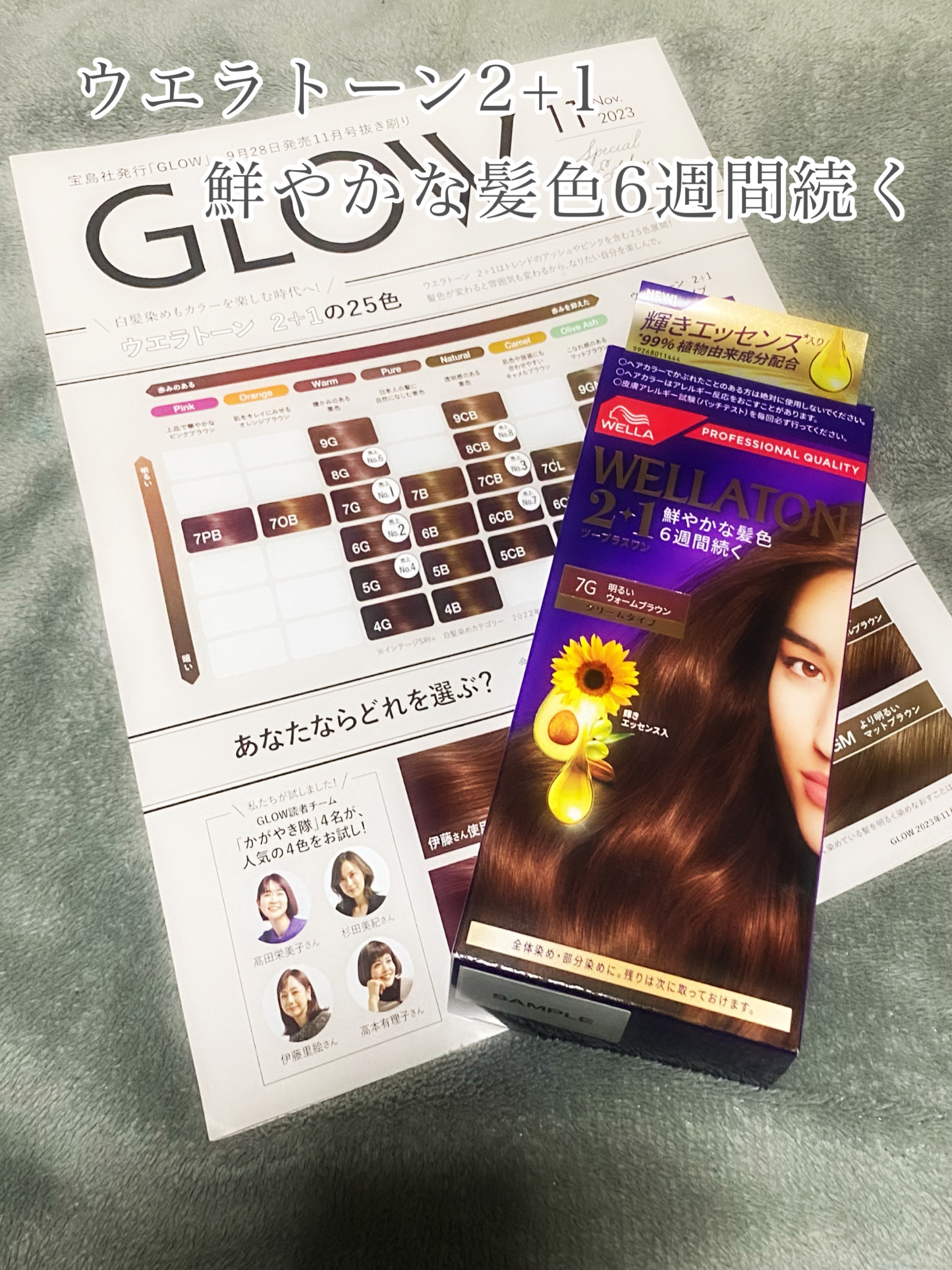 ミクロ色素が髪の内部に浸透。深くリッチなカラーが6週間*続く! 新しくなった「輝きエッセンス**」をプラスワン。輝きエッセンスは 99%植物由来のトリートメント成分配合 今回は7G 明るいウォームブラウンを使いました。