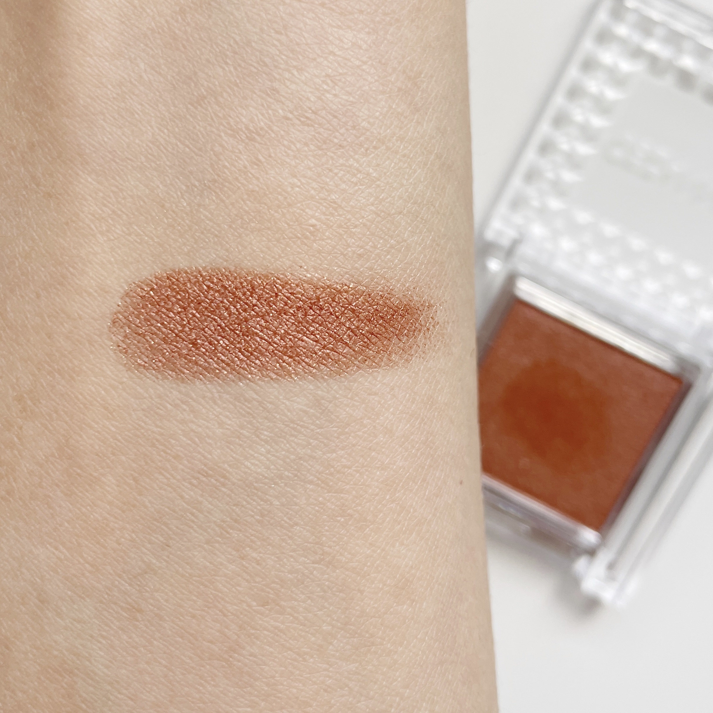 テクスチャーはクリームアイシャドウなので体温でジュワッと溶ける感じなのですが他社のクリームアイシャドウよりも柔らかめだなと感じました。 手で取ると少量でもすごく綺麗なラメ感が出るのでとにかくめちゃくちゃ可愛いです。 お肌に乗せた時の色と仕上がりにめちゃくちゃテンションが上がりました!ほんっっとに可愛いオレンジブラウン! 薄くのばして重ねてもあまりムラが気にならないのでパパッとメイクするときにも使えるしこれ単色でもすごく可愛い。 クリームアイシャドウの中ではまぶたの溝に溜まる量も少なめに感じました。もちろんほんのり溜まっちゃうんですがカラーのおかげもありあまり気にならないかな?という感じ。 カラーの可愛さに本当にびっくりしました。そしてクリームアイシャドウとしてもしっとり感と密着感のバランスが程よくてすごく使いやすく感じています。