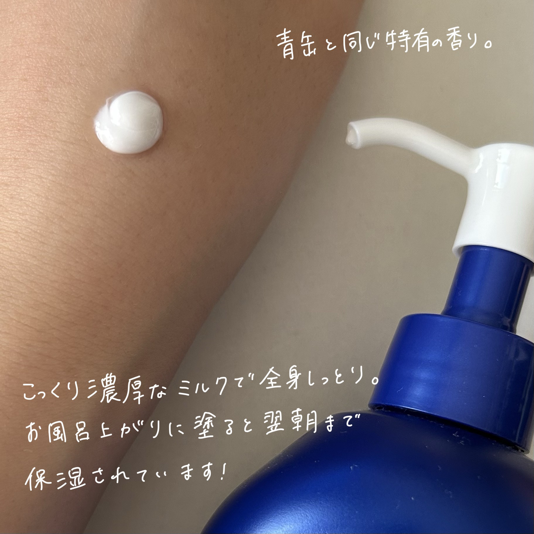乾燥が気になる季節になってくるとこちらを毎年購入しています! 私は近くの薬局で¥350ほどで購入しました! ミルクがクッションのように乾燥から肌を守り、潤いが奪われるのを防ぎます。 ・コクのあるミルク、しっとりタイプ 翌朝までしっとりと長続きしてくれます☺️ 香りはニベア缶の匂いを優しく甘くしたような香りがほんのりと続きます🫧