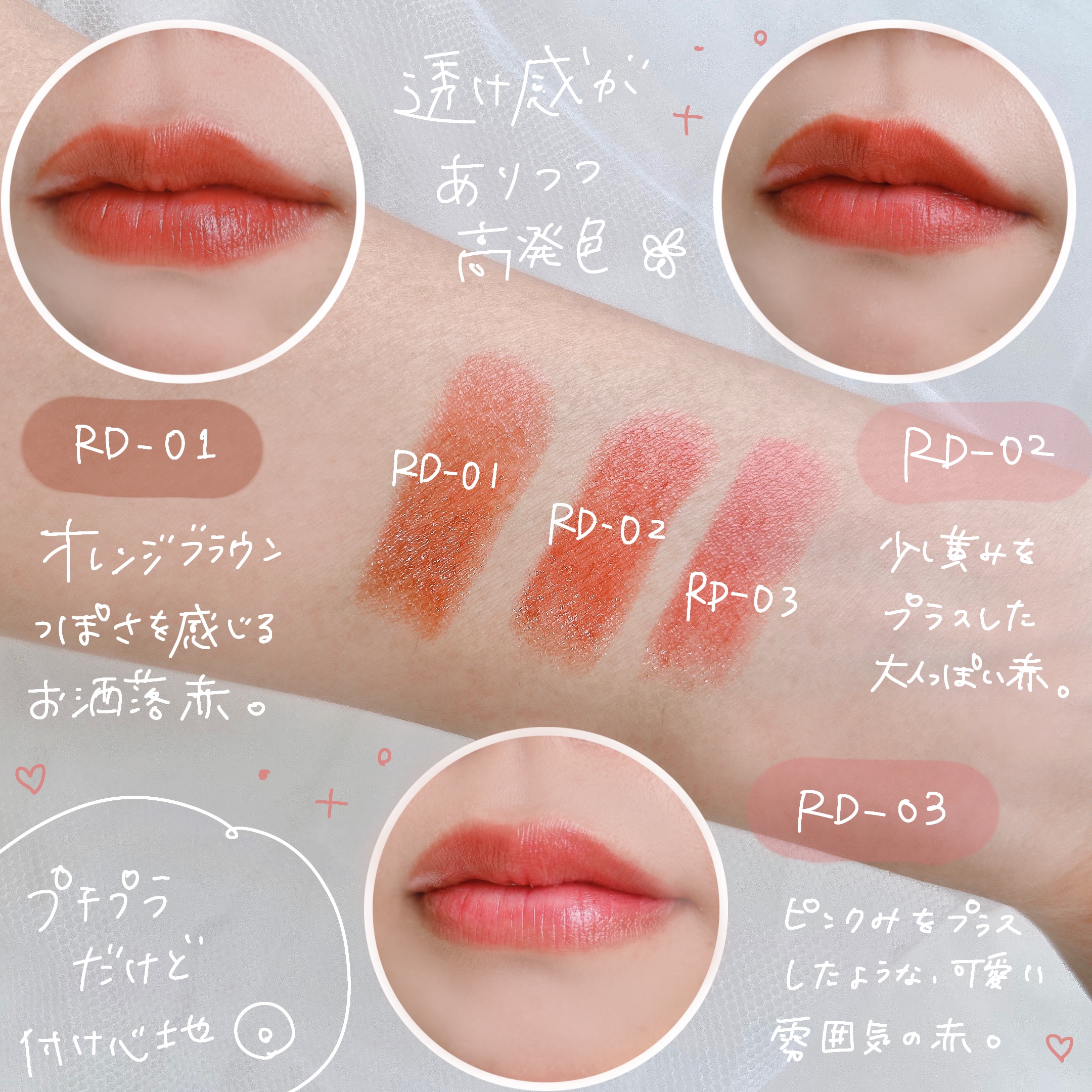 | 口紅・グロス・リップライナーランキング第51位 | ぷるんと つやっとしたティントになるのでまさに水彩画のような透け感のある発色 | 詳細を見る | |