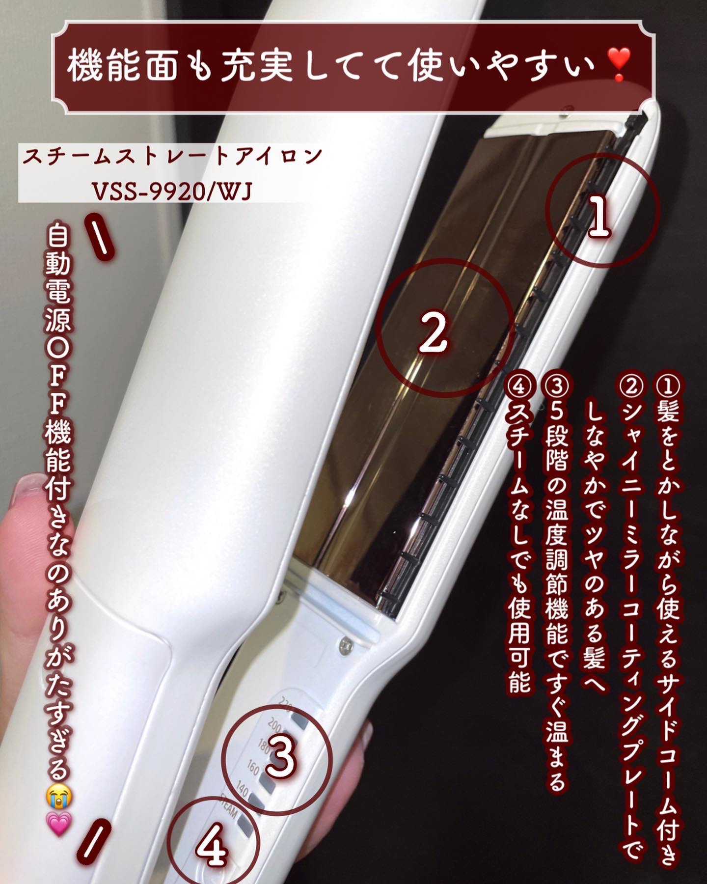 自分の好みで5段階から選べる髪の毛にかかるテンション(上下プレートの間隔)と80℃、100℃、120℃、140℃、160℃、180℃、200℃の7段階から選べる温度調節機能はとっても魅力的なポイントです😄💗✨ 本体の立ち上がりが速くヘアセットを急いでいる時でもサクッと使用できてありがたいです😉💓 何度してみても感動の使い心地でお家でヘアサロン級のセットを叶えてくれるからもう手放す事ができない私の相棒ちゃんです😘✨