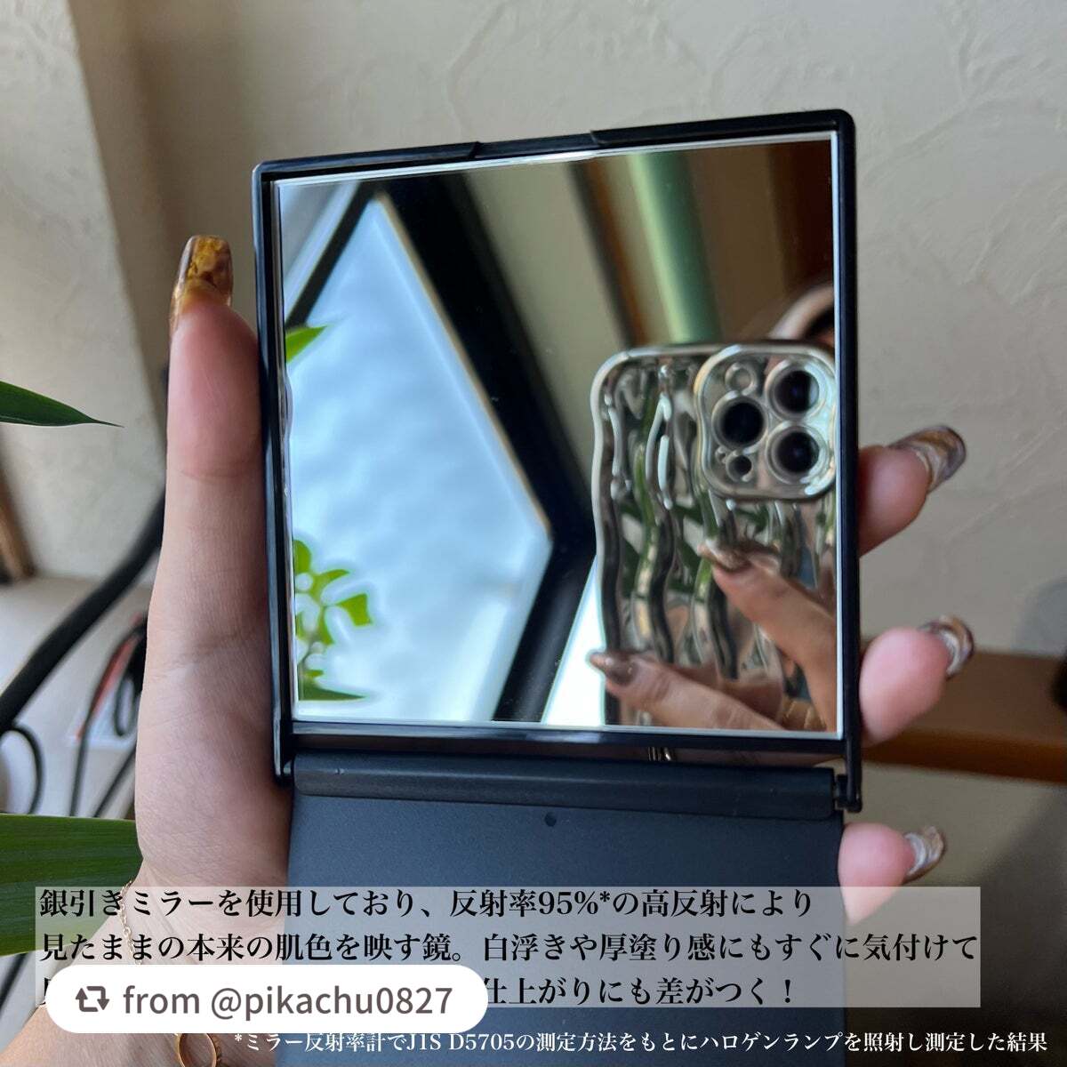 - リアルックミラーは【銀引きミラー】を使用しており、反射率95%(ミラー反射率計でJIS D5705の測定方法をもとにハロゲンランプを照射し測定した結果)の高反射により、見たままの本来の肌色を映します。 <ミニ> 手軽に使えるミニサイズなので、小さなバッグやポーチに入れて持ち運び可能です。