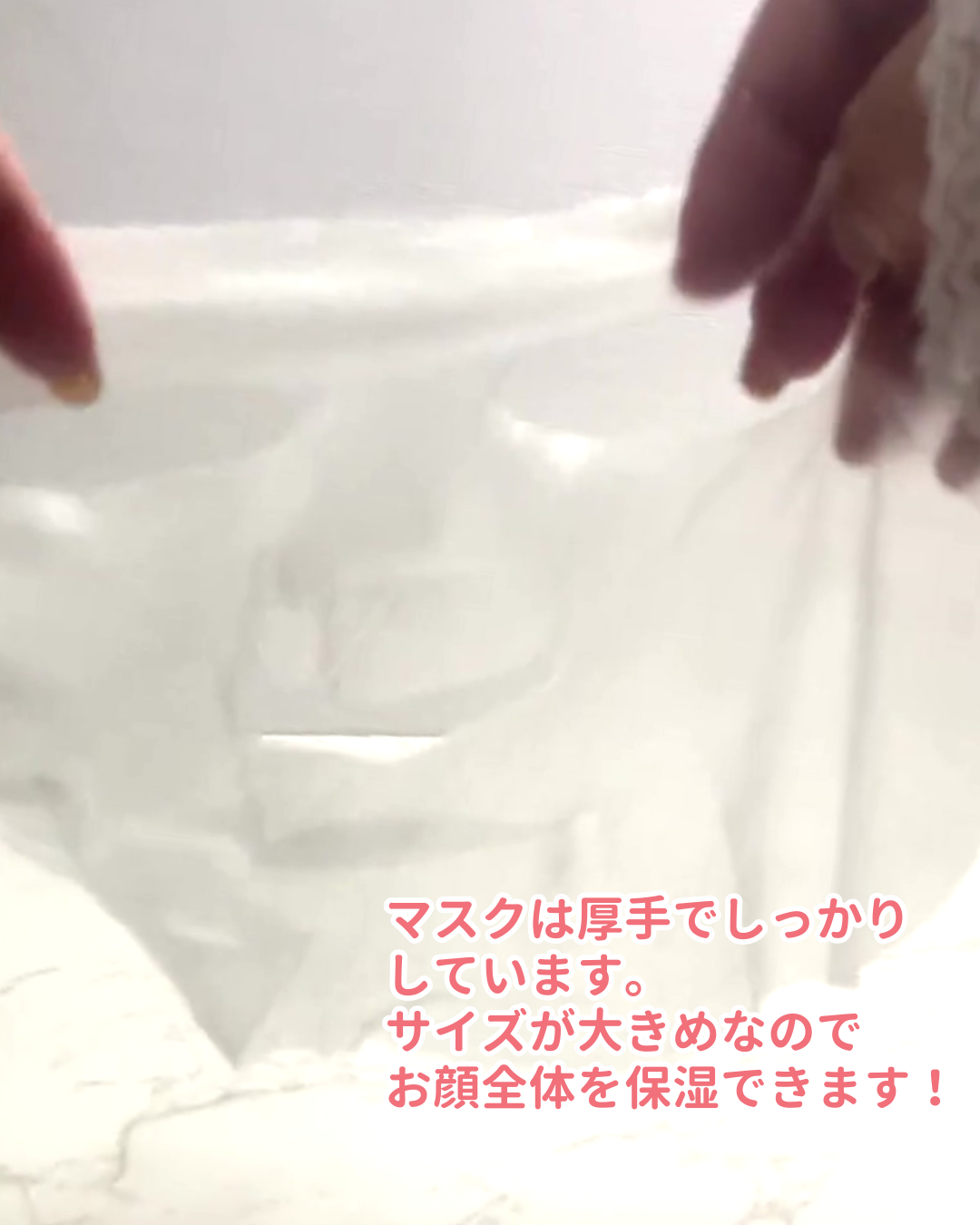 | 美容液がヒタヒタ!!フェイスラインやおでこまでしっかりカバーできる 大きめサイズ、伸びる素材なのが特徴◎ | 詳細を見る |