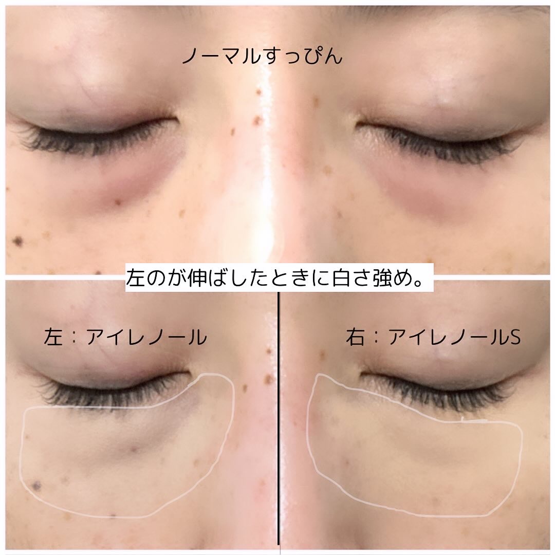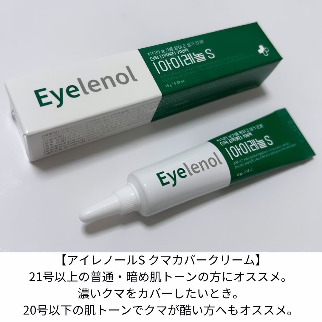 - <アイレノール クマクリーム> 水、シクロペンタシロキサン、グリセリン、ナイアシンアミド、ツボクサ葉エキス、サンゴエキス、パンテノール、イソヘキサデカン、ヒドロキシエチルウレア、ジメチコノール、アラントイン、グリチルリチン酸2K、プロパンジオール、カプリルヒドロキサム酸、香料、オリーブ果実油、酢酸トコフェロール、ホホバ種子油、オレイン酸ソルビタン、アルガニアスピノサ核油、アデノシン、エチルヘキシルグリセリン、プルラン、ヒアルロン酸Na、EDTA-2Na、トリデセス-6、DNA-Na、(アクリル酸グリセリル/アクリル酸)コポリマー、リノール酸グリセリル、ペンチレングリコール、リノレン酸グリセリル、アラキドン酸グリセリル、パルミチン酸レチノール、ラウリン酸K、ピーナッツ油、ヒアルロン酸クロスポリマーNa、トマト果実エキス、ブロッコリーエキス、ケール葉エキス、キャベツ葉エキス、チャ葉エキス、レモン果実エキス、アスパラガスエキス、フラガリアチロエンシス果実エキス、カキ葉エキス、トウガラシ果実エキス、水溶性プロテオグリカン、アスタキサンチン、ヒアルロン酸、トコフェロール、パルミチン酸アスコルビル、酸化チタン、酸化鉄、他 <アイレノール クマクリームS> 水、シクロペンタシロキサン、グリセリン、ナイアシンアミド、ツボクサ葉エキス、サンゴエキス、パンテノール、イソヘキサデカン、ヒドロキシエチルウレア、ジメチコノール、アラントイン、グリチルリチン酸2K、プロパンジオール、カプリルヒドロキサム酸、香料、オリーブ果実油、酢酸トコフェロール、ホホバ種子油、オレイン酸ソルビタン、アルガニアスピノサ核油、アデノシン、エチルヘキシルグリセリン、プルラン、ヒアルロン酸Na、EDTA-2Na、トリデセス-6、DNA-Na、(アクリル酸グリセリル/アクリル酸)コポリマー、リノール酸グリセリル、ペンチレングリコール、リノレン酸グリセリル、アラキドン酸グリセリル、パルミチン酸レチノール、ラウリン酸K、ピーナッツ油、ヒアルロン酸クロスポリマーNa、トマト果実エキス、ブロッコリーエキス、ケール葉エキス、キャベツ葉エキス、チャ葉エキス、レモン果実エキス、アスパラガスエキス、フラガリアチロエンシス果実エキス、カキ葉エキス、トウガラシ果実エキス、水溶性プロテオグリカン、アスタキサンチン、ヒアルロン酸、トコフェロール、パルミチン酸アスコルビル、酸化チタン、酸化鉄、他
