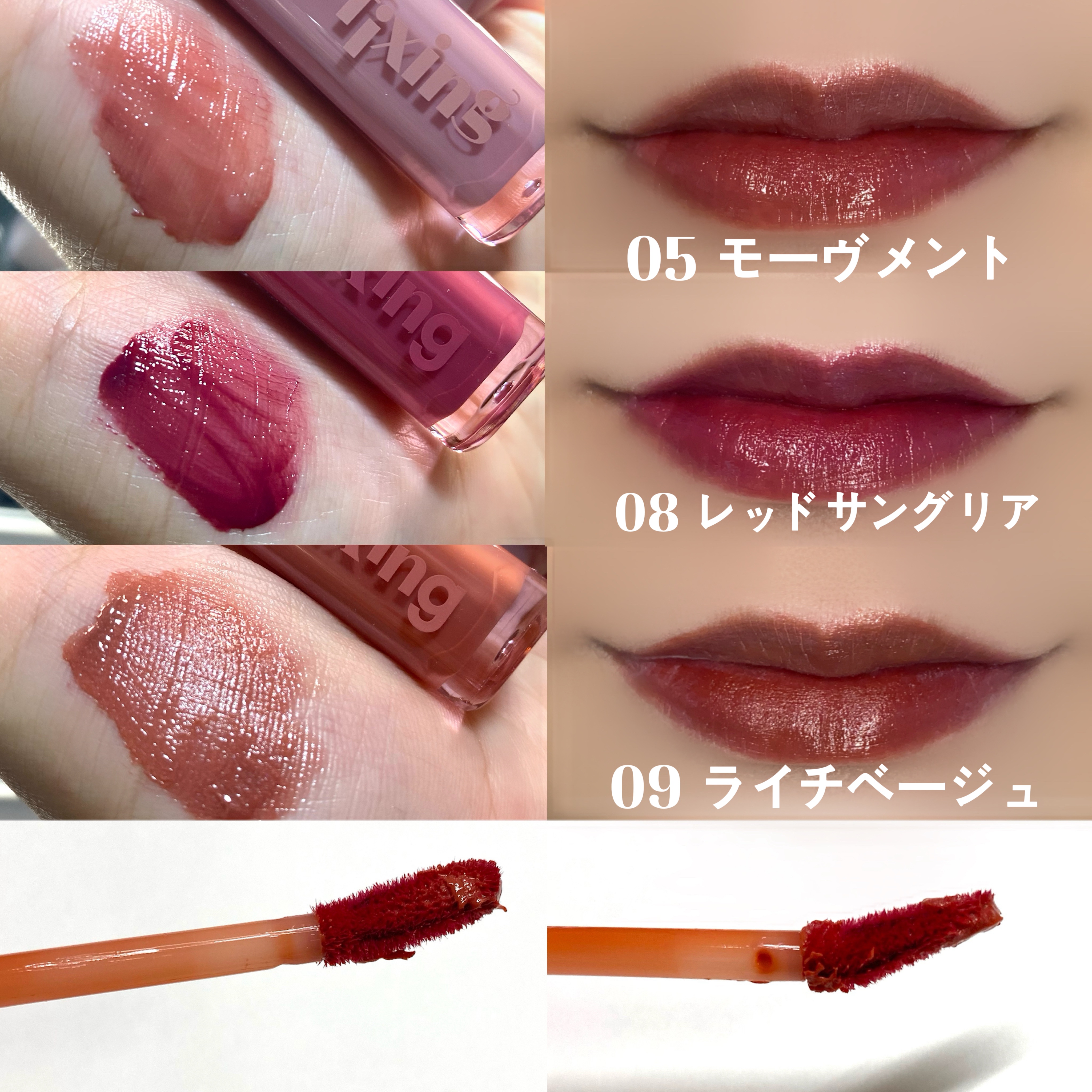 - <ピュアコーラル> 水、トリメチルシロキシフェニルジメチコン、オクチルドデカノール、ダイマージリノール酸ダイマージリノレイルビス(ベヘニル/イソステアリル/フィトステリル)、ポリアミド-8、リンゴ酸ジイソステアリル、ポリソルベート60、BG、セタノール、グリセリン、セスキオレイン酸ソルビタン、変性アルコール、(アクリル酸ヒドロキシエチル/アクリロイルジメチルタウリンNa)コポリマー、ヨーロッパキイチゴ葉エキス、(カプリル酸/カプリン酸)ヤシアルキル、加水分解ヒアルロン酸、(ヒマシ油/IPDI)コポリマー、(カプリル酸/カプリン酸/コハク酸)トリグリセリル、エチルヘキシルグリセリン、トリ(カプリル酸/カプリン酸)グリセリル、カプリリルグリコール、1,2-ヘキサンジオール、トコフェロール、ポリアクリレート-13、ポリイソブテン、テトラ(ジ-t-ブチルヒドロキシヒドロケイヒ酸)ペンタエリスリチル、イソステアリン酸ソルビタン、ポリソルベート20、デヒドロ酢酸、フィチン酸Na、香料、酸化チタン、黄5、赤227、青1 <メロウピンク> 水、トリメチルシロキシフェニルジメチコン、オクチルドデカノール、ダイマージリノール酸ダイマージリノレイルビス(ベヘニル/イソステアリル/フィトステリル)、ポリアミド-8、リンゴ酸ジイソステアリル、ポリソルベート60、BG、セタノール、グリセリン、セスキオレイン酸ソルビタン、変性アルコール、(アクリル酸ヒドロキシエチル/アクリロイルジメチルタウリンNa)コポリマー、ヨーロッパキイチゴ葉エキス、(カプリル酸/カプリン酸)ヤシアルキル、加水分解ヒアルロン酸、(ヒマシ油/IPDI)コポリマー、(カプリル酸/カプリン酸/コハク酸)トリグリセリル、エチルヘキシルグリセリン、トリ(カプリル酸/カプリン酸)グリセリル、カプリリルグリコール、1,2-ヘキサンジオール、トコフェロール、ポリアクリレート-13、ポリイソブテン、テトラ(ジ-t-ブチルヒドロキシヒドロケイヒ酸)ペンタエリスリチル、イソステアリン酸ソルビタン、ポリソルベート20、デヒドロ酢酸、フィチン酸Na、香料、酸化チタン、黄5、赤227、青1 <デューイーフィグ> 水、トリメチルシロキシフェニルジメチコン、オクチルドデカノール、ダイマージリノール酸ダイマージリノレイルビス(ベヘニル/イソステアリル/フィトステリル)、ポリアミド-8、リンゴ酸ジイソステアリル、ポリソルベート60、BG、セタノール、グリセリン、セスキオレイン酸ソルビタン、変性アルコール、(アクリル酸ヒドロキシエチル/アクリロイルジメチルタウリンNa)コポリマー、ヨーロッパキイチゴ葉エキス、(カプリル酸/カプリン酸)ヤシアルキル、加水分解ヒアルロン酸、(ヒマシ油/IPDI)コポリマー、(カプリル酸/カプリン酸/コハク酸)トリグリセリル、エチルヘキシルグリセリン、トリ(カプリル酸/カプリン酸)グリセリル、カプリリルグリコール、1,2-ヘキサンジオール、トコフェロール、ポリアクリレート-13、ポリイソブテン、テトラ(ジ-t-ブチルヒドロキシヒドロケイヒ酸)ペンタエリスリチル、イソステアリン酸ソルビタン、ポリソルベート20、デヒドロ酢酸、フィチン酸Na、香料、酸化チタン、黄5、赤227、青1 <チリングレッド> 水、トリメチルシロキシフェニルジメチコン、オクチルドデカノール、ダイマージリノール酸ダイマージリノレイルビス(ベヘニル/イソステアリル/フィトステリル)、ポリアミド-8、リンゴ酸ジイソステアリル、ポリソルベート60、BG、セタノール、グリセリン、セスキオレイン酸ソルビタン、変性アルコール、(アクリル酸ヒドロキシエチル/アクリロイルジメチルタウリンNa)コポリマー、ヨーロッパキイチゴ葉エキス、(カプリル酸/カプリン酸)ヤシアルキル、加水分解ヒアルロン酸、(ヒマシ油/IPDI)コポリマー、(カプリル酸/カプリン酸/コハク酸)トリグリセリル、エチルヘキシルグリセリン、トリ(カプリル酸/カプリン酸)グリセリル、カプリリルグリコール、1,2-ヘキサンジオール、トコフェロール、ポリアクリレート-13、ポリイソブテン、テトラ(ジ-t-ブチルヒドロキシヒドロケイヒ酸)ペンタエリスリチル、イソステアリン酸ソルビタン、ポリソルベート20、デヒドロ酢酸、フィチン酸Na、香料、黄5、赤227、青1 <モーヴメント> 水、トリメチルシロキシフェニルジメチコン、オクチルドデカノール、ダイマージリノール酸ダイマージリノレイルビス(ベヘニル/イソステアリル/フィトステリル)、ポリアミド-8、リンゴ酸ジイソステアリル、ポリソルベート60、BG、セタノール、グリセリン、セスキオレイン酸ソルビタン、変性アルコール、(アクリル酸ヒドロキシエチル/アクリロイルジメチルタウリンNa)コポリマー、ヨーロッパキイチゴ葉エキス、(カプリル酸/カプリン酸)ヤシアルキル、加水分解ヒアルロン酸、(ヒマシ油/IPDI)コポリマー、(カプリル酸/カプリン酸/コハク酸)トリグリセリル、エチルヘキシルグリセリン、トリ(カプリル酸/カプリン酸)グリセリル、カプリリルグリコール、1,2-ヘキサンジオール、トコフェロ