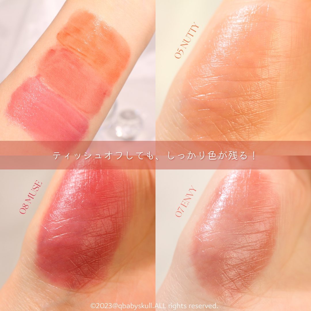 - <#01 ゴート> 精製水、ジフェニルジメチコン、オクチルドデカノール、ジグリセリン、フェニルトリメチコン、水添ポリイソブテン、水添ポリシクロペンタジエン、ポリソルベート60、ペンチレングリコール、セテアレス-20、トリメチルシロキシケイ酸、ダイメジメチコン、アクリル酸ヒドロキシエチル/ナトリウムアクリロイルジメチルタウリン酸共重合体スクアラン、フェノキシエタノール、エチルセルロース、ラウリルPEG-9ポリジメチルシロキシエチルジメチコン、黄色5 号、香料、エチルヘキシルグリセリン、赤色227号、イソステアリン酸ソルビタン、エチレンジアミンジコハク酸3Na、赤色104号(1)、ブリリアントブルーFCF、トコフェロール <#02 ローズフル> 精製水、ジフェニルジメチコン、オクチルドデカノール、ジグリセリン、フェニルトリメチコン、水添ポリイソブテン、水添ポリシクロペンタジエン、ポリソルベート60、ペンチレングリコール、セテアレス-20、トリメチルシロキシケイ酸、ダイメジメチコン、アクリル酸ヒドロキシエチル/ナトリウムアクリロイルジメチルタウリン酸共重合体スクアラン、フェノキシエタノール、エチルセルロース、ラウリルPEG-9ポリジメチルシロキシエチルジメチコン、香料、二酸化チタン、エチルヘキシルグリセリン、黄色5 号、赤色227号、イソステアリン酸ソルビタン、エチレンジアミンジコハク酸3Na、黄色4号、赤色104号(1)、水酸化酸化アルミニウム、ポリアクリル酸アンモニウム溶液、ブリリアントブルーFCF、BG、トコフェロール <#03 スタニング> 精製水、ジフェニルジメチコン、オクチルドデカノール、ジグリセリン、フェニルトリメチコン、水添ポリイソブテン、水添ポリシクロペンタジエン、ポリソルベート60、ペンチレングリコール、セテアレス-20、トリメチルシロキシケイ酸、ダイメジメチコン、アクリル酸ヒドロキシエチル/ナトリウムアクリロイルジメチルタウリン酸共重合体スクアラン、フェノキシエタノール、エチルセルロース、ラウリルPEG-9ポリジメチルシロキシエチルジメチコン、二酸化チタン、香料、黄色5 号、エチルヘキシルグリセリン、赤色227号、イソステアリン酸ソルビタン、エチレンジアミンジコハク酸3Na、水酸化酸化アルミニウム、ポリアクリル酸アンモニウム溶液、BG、ブリリアントブルーFCF、トコフェロール <#04 ムアー > 精製水、ジフェニルジメチコン、オクチルドデカノール、ジグリセリン、フェニルトリメチコン、水添ポリイソブテン、水添ポリシクロペンタジエン、ポリソルベート60、ペンチレングリコール、セテアレス-20、トリメチルシロキシケイ酸、ダイメジメチコン、アクリル酸ヒドロキシエチル/ナトリウムアクリロイルジメチルタウリン酸共重合体スクアラン、フェノキシエタノール、エチルセルロース、ラウリルPEG-9ポリジメチルシロキシエチルジメチコン、二酸化チタン、黄色5 号、香料、エチルヘキシルグリセリン、赤色227号、イソステアリン酸ソルビタン、エチレンジアミンジコハク酸3Na、水酸化酸化アルミニウム、ポリアクリル酸アンモニウム溶液、黄色4号、BG、ブリリアントブルーFCF、トコフェロール <#05 ナッティー> 精製水、ジフェニルジメチコン、オクチルドデカノール、ジグリセリン、フェニルトリメチコン、水添ポリイソブテン、水添ポリシクロペンタジエン、ポリソルベート60、ペンチレングリコール、セテアレス-20、トリメチルシロキシケイ酸、ダイメジメチコン、アクリル酸ヒドロキシエチル/ナトリウムアクリロイルジメチルタウリン酸共重合体スクアラン、フェノキシエタノール、エチルセルロース、ラウリルPEG-9ポリジメチルシロキシエチルジメチコン、二酸化チタン、香料、エチルヘキシルグリセリン、黄色5 号、イソステアリン酸ソルビタン、エチレンジアミンジコハク酸3Na、赤色227号、黄色4号、水酸化酸化アルミニウム、ポリアクリル酸アンモニウム溶液、ブリリアントブルーFCF、BG、トコフェロール <#06 デリッシュ > 精製水、ジフェニルジメチコン、オクチルドデカノール、ジグリセリン、水添ポリイソブテン、フェニルトリメチコン、水添ポリシクロペンタジエン、ポリソルベート60、ペンチレングリコール、セテアレス-20、トリメチルシロキシケイ酸、ダイメジメチコン、アクリル酸ヒドロキシエチル/ナトリウムアクリロイルジメチルタウリン酸共重合体スクアラン、エチルセルロース、ラウリルPEG-9ポリジメチルシロキシエチルジメチコン、エチルヘキシルグリセリン、イソステアリン酸ソルビタン、エチレンジアミンジコハク酸3Na、水酸化酸化アルミニウム、ポリアクリル酸アンモニウム溶液、BG、トコフェロール、フェノキシエタノール、香料、二酸化チタン(CI 77891)、黄色5号(CI 15985)、赤色227号 (CI 17200)、黄色4号(CI 19140)、青色1号(CI 42090) <#07 エンヴィ > 精製水、ジフェニルジメチコン、オクチルドデカノール、ジグリセリン、水添ポリイソブテン、フェニルトリメチコン、水添ポリシクロペン