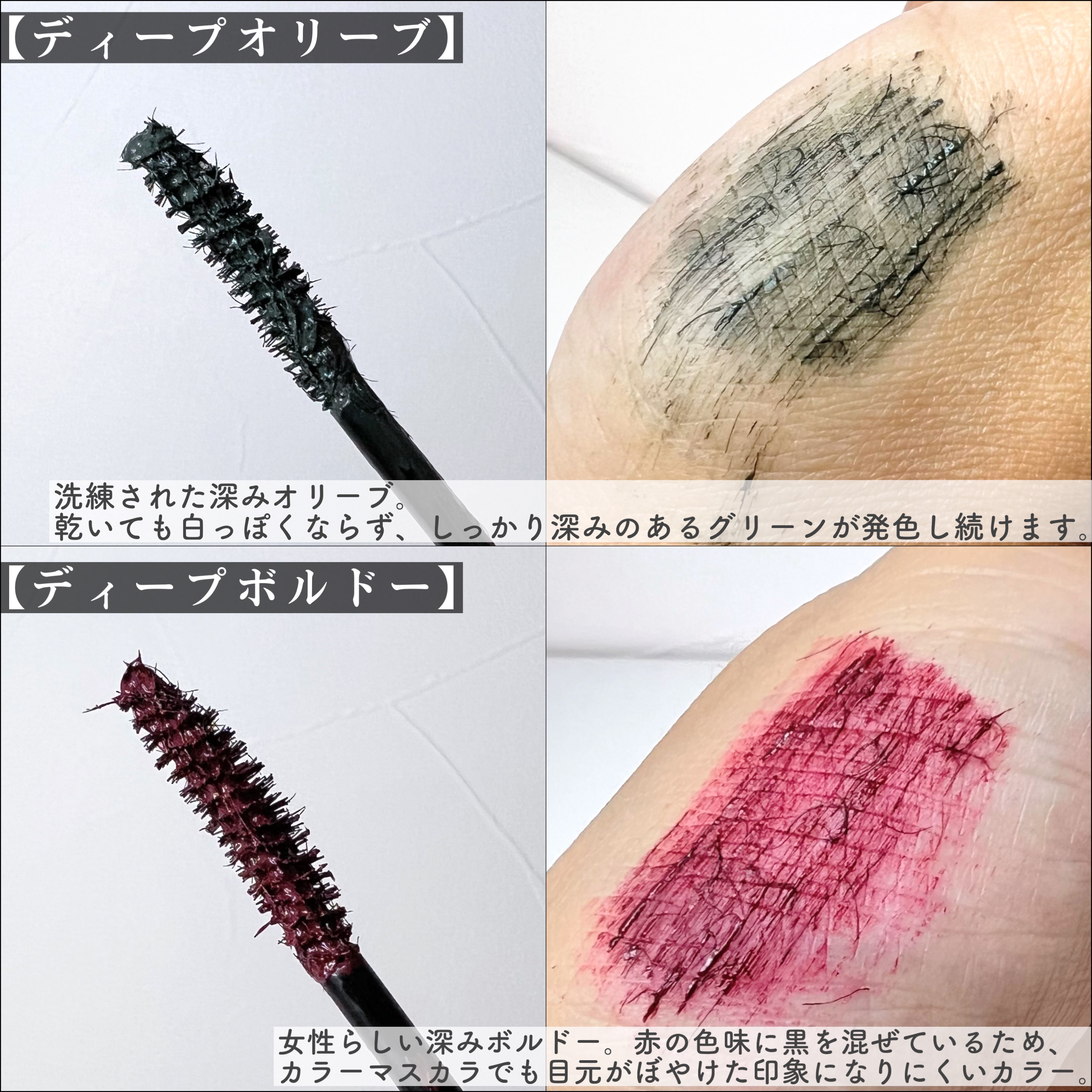 - <ブラック> 水、アクリレーツコポリマー、カルナウバロウ、ミツロウ、BG、カオリン、ステアリン酸、(VP/エイコセン)コポリマー、水添ナタネ油アルコール、ナイロン-6、ポリステアリン酸スクロース、シリカ、パンテノール、加水分解ケラチン(羊毛)、加水分解エンドウタンパク、加水分解シルク、加水分解コンキオリン、トゲキリンサイ/ヒヂリメン/ミツイシコンブ/ウスバアオノリ/ワカメエキス、サガラメエキス、ビルベリー葉エキス、AMP、ヒドロキシエチルセルロース、デヒドロ酢酸Na、ラウレス-21、ポリアクリル酸Na、メチルパラベン、酸化鉄、カーボンブラック <ピンクブラウン> 水、アクリレーツコポリマー、カルナウバロウ、ミツロウ、BG、カオリン、ステアリン酸、(VP/エイコセン)コポリマー、水添ナタネ油アルコール、ナイロン-6、ポリステアリン酸スクロース、シリカ、パンテノール、加水分解ケラチン(羊毛)、加水分解エンドウタンパク、加水分解シルク、加水分解コンキオリン、トゲキリンサイ/ヒヂリメン/ミツイシコンブ/ウスバアオノリ/ワカメエキス、サガラメエキス、ビルベリー葉エキス、AMP、ヒドロキシエチルセルロース、デヒドロ酢酸Na、ラウレス-21、ポリアクリル酸Na、メチルパラベン、酸化鉄、カーボンブラック <モカピンク> 水、アクリレーツコポリマー、カルナウバロウ、ミツロウ、BG、カオリン、ステアリン酸、(VP/エイコセン)コポリマー、水添ナタネ油アルコール、ナイロン-6、ポリステアリン酸スクロース、シリカ、パンテノール、加水分解ケラチン(羊毛)、加水分解エンドウタンパク、加水分解シルク、加水分解コンキオリン、トゲキリンサイ/ヒヂリメン/ミツイシコンブ/ウスバアオノリ/ワカメエキス、サガラメエキス、ビルベリー葉エキス、AMP、ポリソルベート80、ヒドロキシエチルセルロース、デヒドロ酢酸Na、ラウレス-21、ポリアクリル酸Na、メチルパラベン、酸化鉄、酸化チタン、水酸化Alカーボンブラック <ミッドナイトネイビー> 水、アクリレーツコポリマー、カルナウバロウ、ミツロウ、BG、カオリン、ステアリン酸、(VP/エイコセン)コポリマー、水添ナタネ油アルコール、ナイロン-6、ポリステアリン酸スクロース、シリカ、パンテノール、加水分解ケラチン(羊毛)、加水分解エンドウタンパク、加水分解シルク、加水分解コンキオリン、トゲキリンサイ/ヒヂリメン/ミツイシコンブ/ウスバアオノリ/ワカメエキス、サガラメエキス、ビルベリー葉エキス、AMP、ポリソルベート80、ヒドロキシエチルセルロース、デヒドロ酢酸Na、ラウレス-21、ポリアクリル酸Na、メチルパラベン、グンジョウ、酸化鉄、カーボンブラック <サンセットオレンジ> 水、アクリレーツコポリマー、BG、カルナウバロウ、ミツロウ、カオリン、ステアリン酸、(VP/エイコセン)コポリマー、水添ナタネ油アルコール、ナイロン-6、ポリステアリン酸スクロース、シリカ、パンテノール、加水分解ケラチン(羊毛)、加水分解エンドウタンパク、加水分解シルク、加水分解コンキオリン、トゲキリンサイ/ヒヂリメン/ミツイシコンブ/ウスバアオノリ/ワカメエキス、サガラメエキス、ビルベリー葉エキス、AMP、ポリソルベート80、ヒドロキシエチルセルロース、デヒドロ酢酸Na、ラウレス-21、ポリアクリル酸Na、メチルパラベン、酸化鉄、カーボンブラック <ディープボルドー> 水、アクリレーツコポリマー、BG、カルナウバロウ、ミツロウ、カオリン、ステアリン酸、(VP/エイコセン)コポリマー、水添ナタネ油アルコール、ナイロン-6、ポリステアリン酸スクロース、シリカ、パンテノール、加水分解ケラチン(羊毛)、加水分解エンドウタンパク、加水分解シルク、加水分解コンキオリン、トゲキリンサイ/ヒヂリメン/ミツイシコンブ/ウスバアオノリ/ワカメエキス、サガラメエキス、ビルベリー葉エキス、AMP、ポリソルベート80、ヒドロキシエチルセルロース、デヒドロ酢酸Na、ラウレス-21、ポリアクリル酸Na、メチルパラベン、水酸化Al、赤226、グンジョウ、酸化鉄、カーボンブラック <ディープオリーブ> 水、アクリレーツコポリマー、BG、カルナウバロウ、ミツロウ、カオリン、ステアリン酸、(VP/エイコセン)コポリマー、水添ナタネ油アルコール、ナイロン-6、ポリステアリン酸スクロース、シリカ、パンテノール、加水分解ケラチン(羊毛)、加水分解エンドウタンパク、加水分解シルク、加水分解コンキオリン、トゲキリンサイ/ヒヂリメン/ミツイシコンブ/ウスバアオノリ/ワカメエキス、サガラメエキス、ビルベリー葉エキス、AMP、ポリソルベート80、ヒドロキシエチルセルロース、デヒドロ酢酸Na、ラウレス-21、ポリアクリル酸Na、メチルパラベン、酸化鉄、水酸化クロム、グンジョウ、カーボンブラック