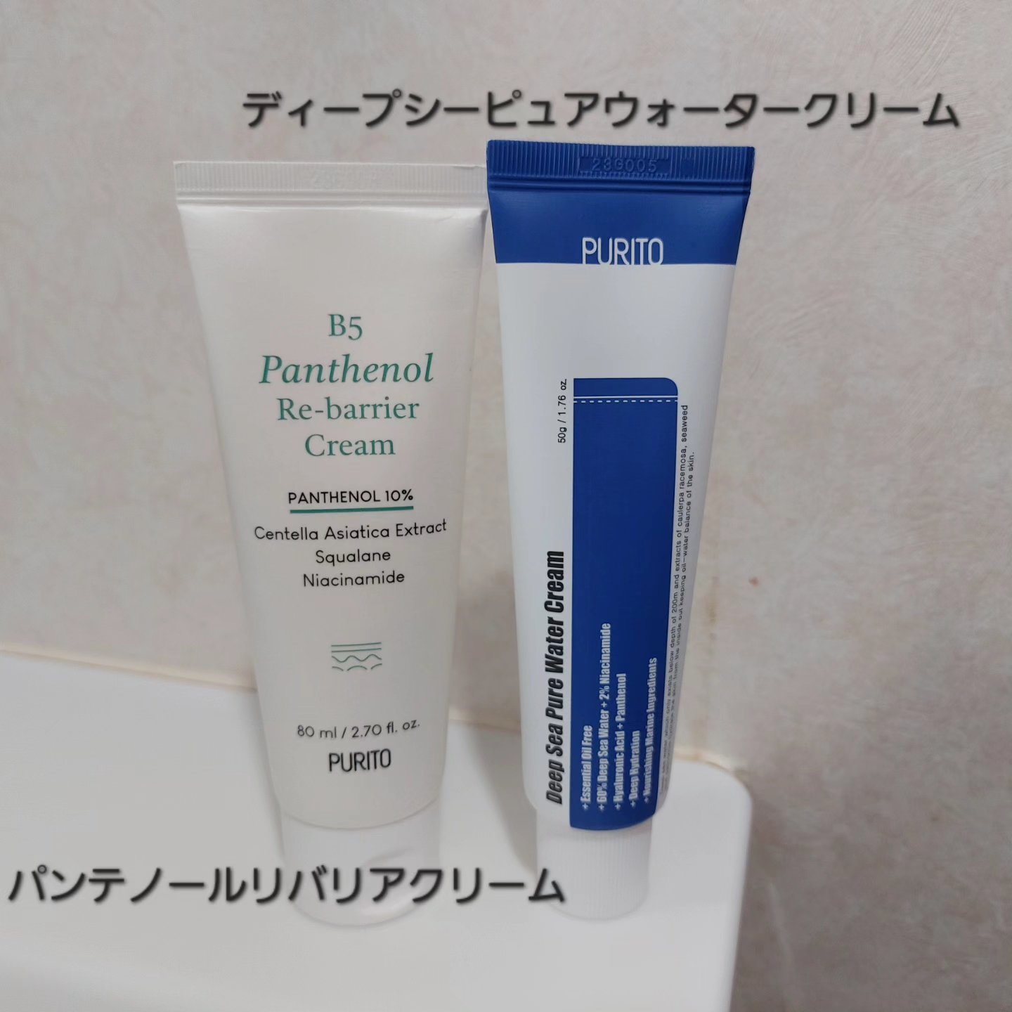 使いきり!PURITOのB5パンテノールリバリアクリーム。お肌にぴたっとすーっとなテクスチャでみずみずしいのにベタつかない、さっぱりめ。パンテノール配合で肌に浸透しやすく、保湿力に優れ肌の水分が蒸発するのを防ぎ、水分保持もできるので肌のバリア...