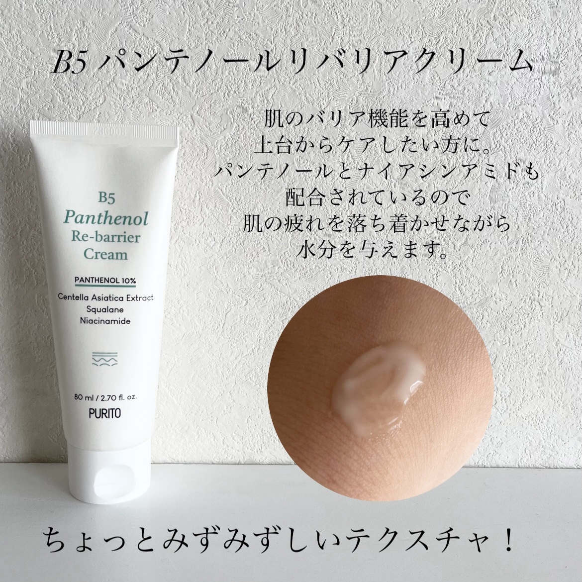 使いきり!PURITOのB5パンテノールリバリアクリーム。お肌にぴたっとすーっとなテクスチャでみずみずしいのにベタつかない、さっぱりめ。パンテノール配合で肌に浸透しやすく、保湿力に優れ肌の水分が蒸発するのを防ぎ、水分保持もできるので肌のバリア...
