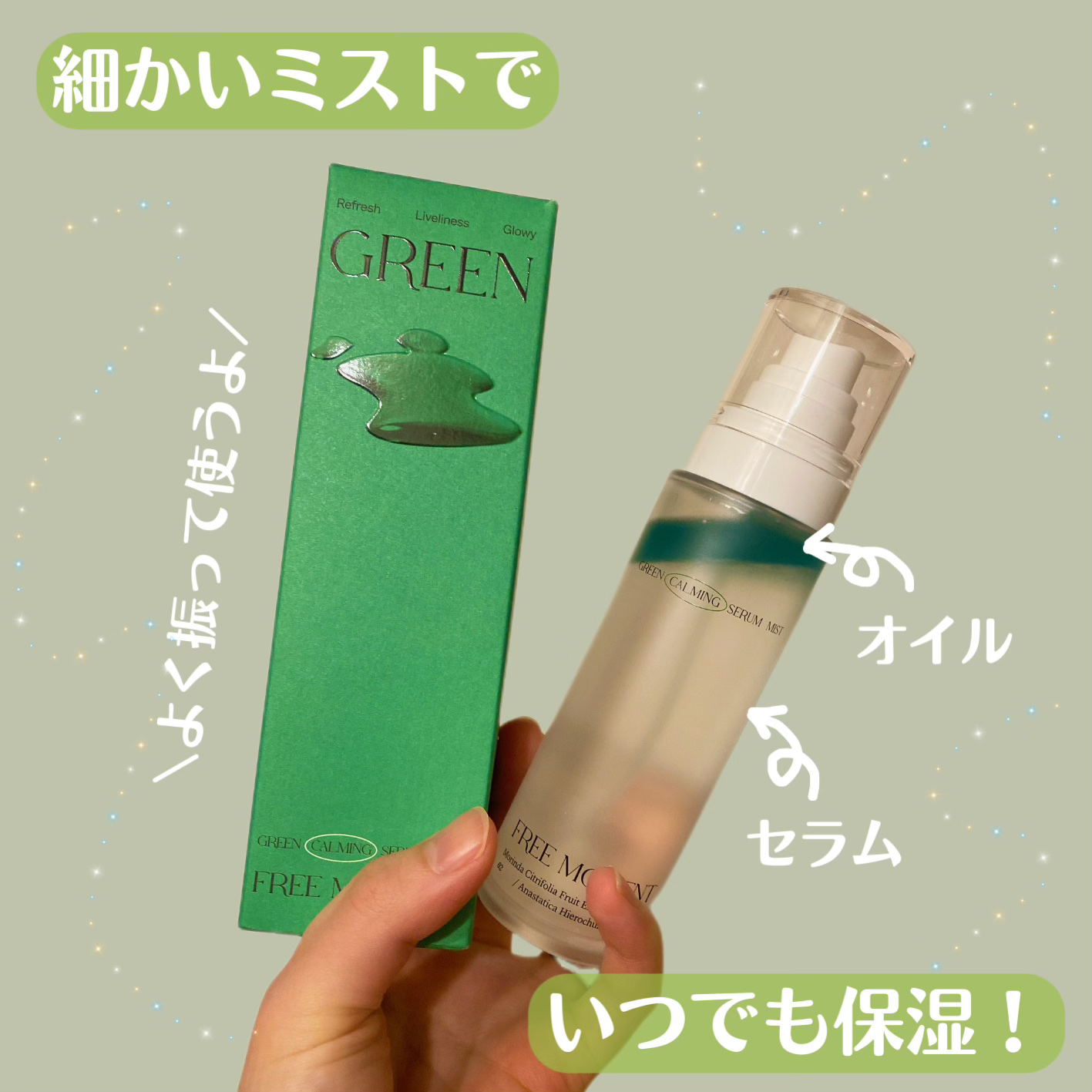 #PR#FreeMomentさまx#はいらいとさまのコラボキャンペーンに当選#グリーンカーミングセラムミストを頂きましたとっても細かいミスト、肌当たりがとても優しい美容液🌿スーッと吸い込まれるような肌馴染み💚グリーンカーミングミスト■100%...