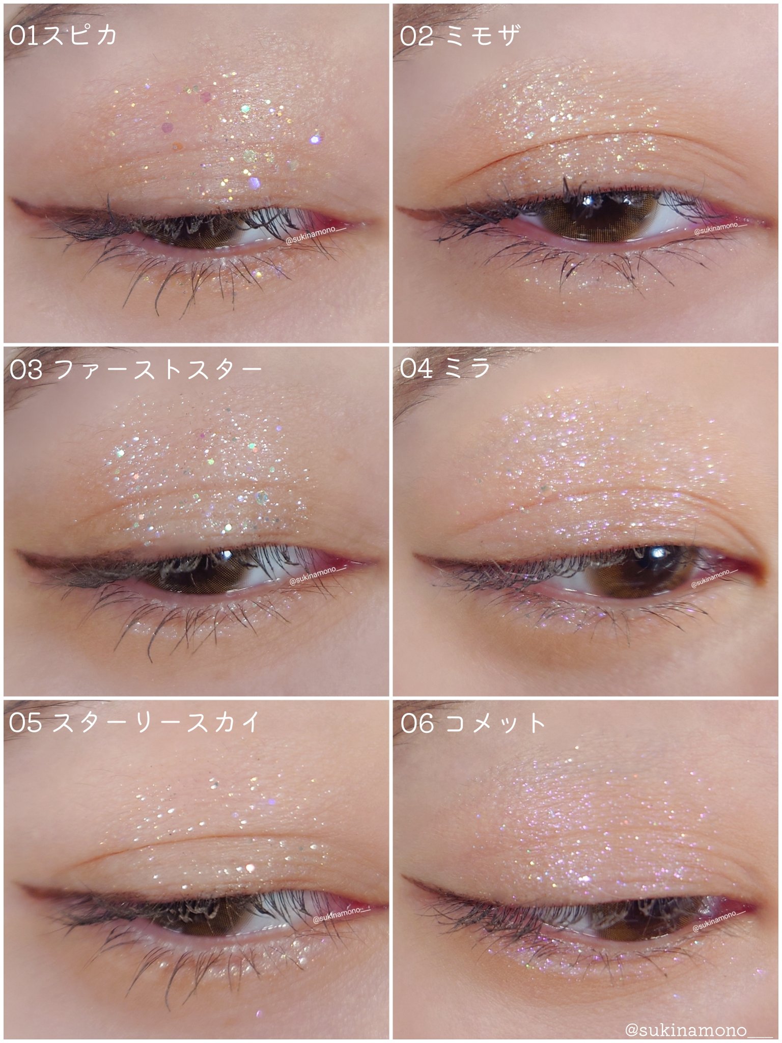 - <星空の輝きを瞳に宿して。> 繊細なラメはまるで夜空に輝く星のよう。 普段のアイメイクに華やかさをプラスしてくれます。 保湿成分と柔らかいブラシでデリケートな目の周りも優しい使い心地でメイクアップ。 全6色のカラー展開なので、多様なスタイルをお楽しみいただけます。