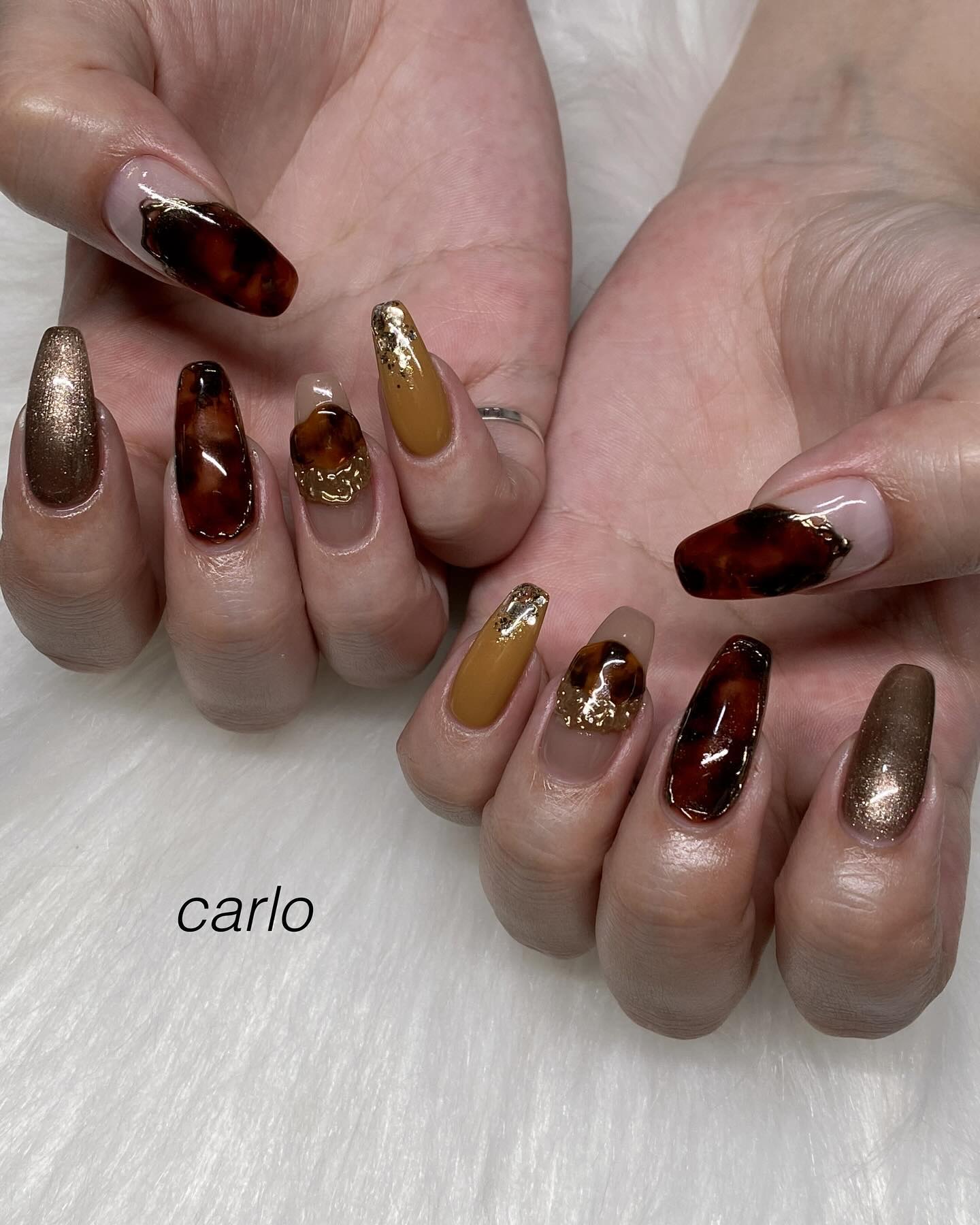 【☾ゴージャスart】所沢市ネイルサロン|Carlo.抜け感のある秋color🍂とmirrorpowderがかわいい🤎🩶.¥8500-.———————————————open9:00-close18:00ご予約・お問合せLINEID@797v...