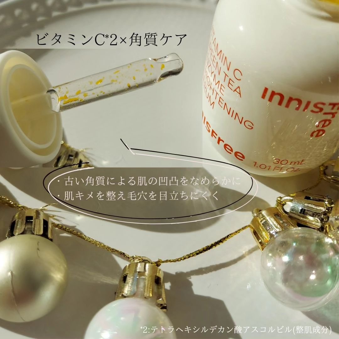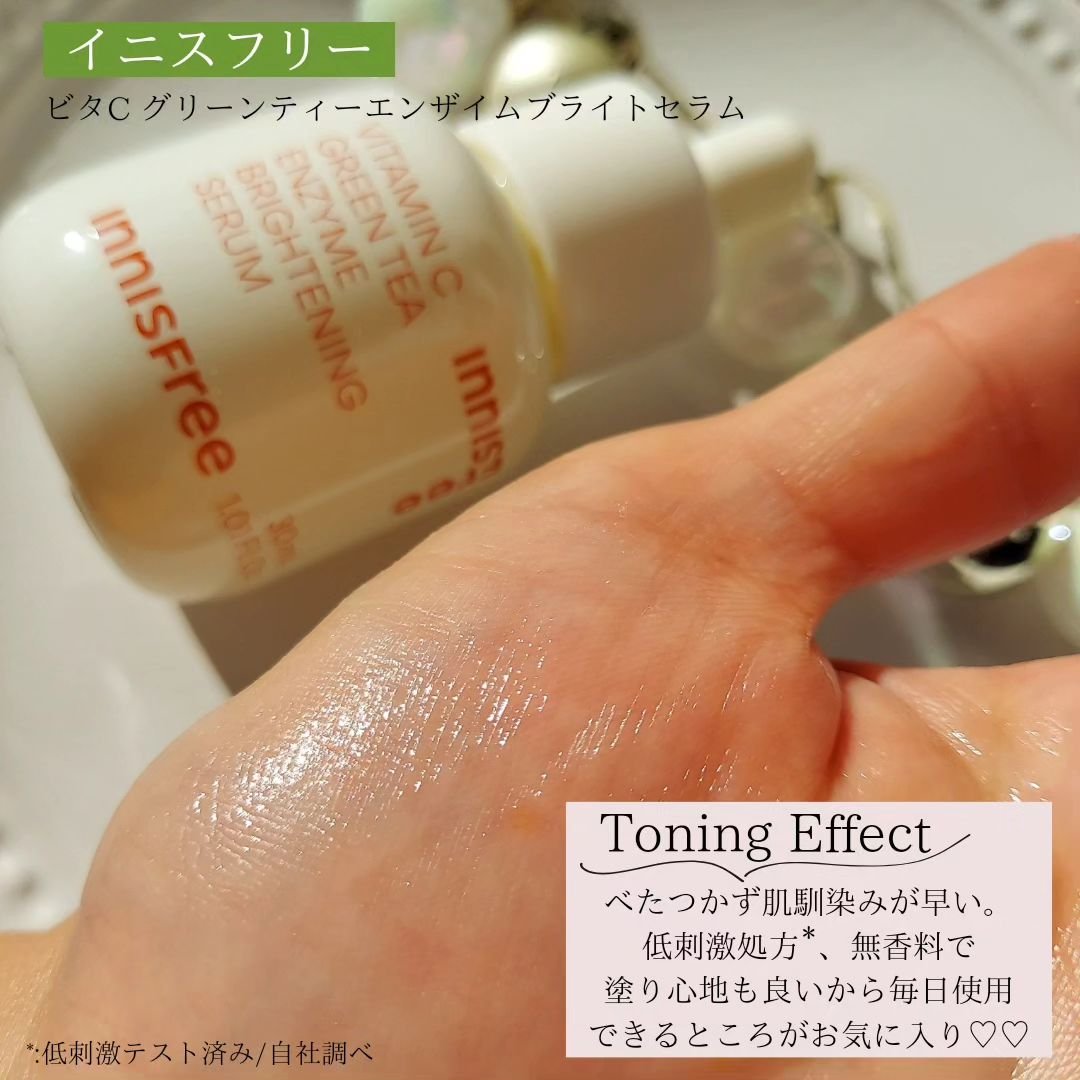 緑茶酵素×ビタミンC(イニスフリーオリジナル処方)で角質ケアをしたなめらかな肌にWビタミンCが浸透してワンランク上の透明感を叶える! トロッとしたテクスチャーで伸びが凄く良いのと敏感肌でも特に刺激を感じずに使用できる所がGood☺︎☺︎ 赤みが強い跡は少しずつ小さくなっていますし茶色がかった跡は少しずつ薄くなっている気がしてます!!
