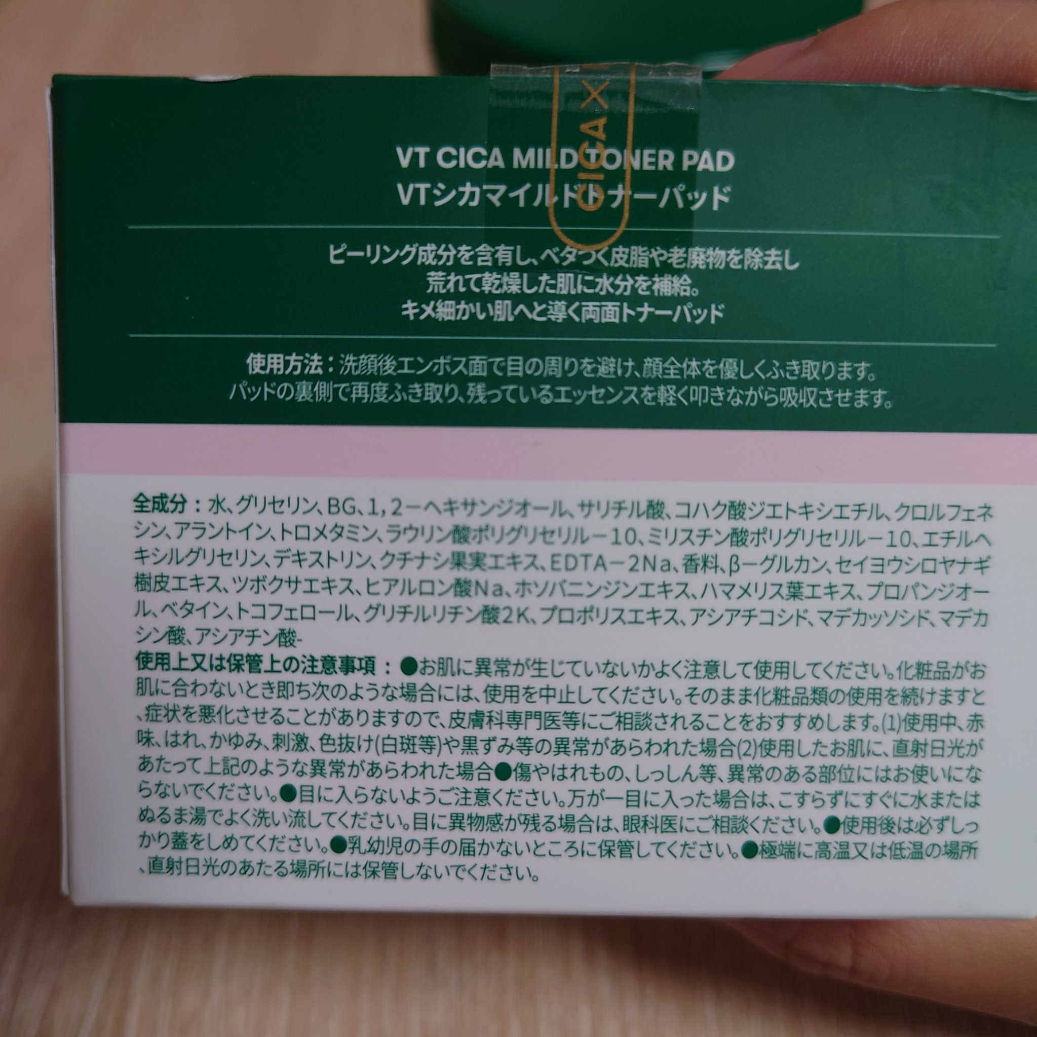 でこぼこのエンボス面で不必要な角質や毛穴汚れなどを拭き取れるトナーパッド! 朝ぬるま湯で顔を洗ってから、メイク前にトナーパットで拭き取るのが大好き🌟 夜のケアだと、赤みやポツポツニキビが気になる部分にパットを抑えて部分用パックとして使うのも好き!! VTのCICAはとにかく肌荒れが気になる時 (赤みやニキビ)に使用するのがおすすめ🌿💚