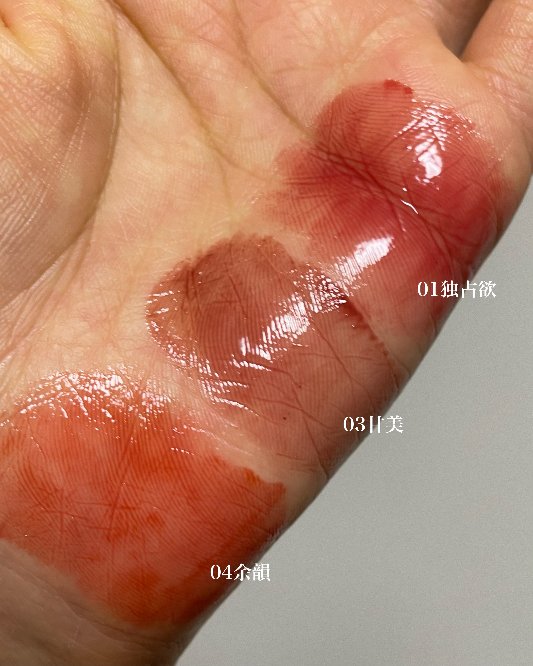 - <01 独占欲> ビリンゴ酸ジイソステアリル、水、ビスジグリセリルポリアシルアジペート-2、トリメチルシロキシフェニルジメチコン、水添ポリイソブテン、ポリフェニルシル セスキオキサン、ダイマージリノール酸ダイマージリノレイルビス(ベヘニル/イソステアリル/フィトステリル)、ジグリセリン、セチルPEG/PPG-10/1ジメチコン、1,2-ヘキサンジオール、セテアレス-20、(アクリル酸ヒドロキシエチル/アクリロイルジメチルタウリンNa)コポリマー、ポリソルベート60、スクワラン、フェノキ シエタノール、ベヘニルアルコール、メントキシプロパンジオール、酸化チタン、ポリグリセリン-3、エチルヘキシルグリセリン、黄5、赤227、イソステアリン酸 ソルビタン、グリセリン、赤104(1)、黄4、水酸化AI、ポリアクリル酸アンモニウム、青1、BG、ツバキ種子油、アルガニアスピノサ核油、アーモンド油、ティー ツリー葉油、ハチミツエキス <02 羨望> リンゴ酸ジイソステアリル、水、ビスジグリセリルポリアシルアジペート-2、トリメチルシロキシフェニルジメチコン、水添ポリイソブテン、ポリフェニルシルセ スキオキサン、ダイマージリノール酸ダイマージリノレイルビス(ベヘニル/イソステアリル/フィトステリル)、ジグリセリン、セチルPEG/PPG-10/1ジメチコン、1,2-ヘキサンジオール、セテアレス-20、(アクリル酸ヒドロキシエチル/アクリロイルジメチルタウリンNa)コポリマー、ポリソルベート60、スクワラン、フェノキ シエタノール、ベヘニルアルコール、酸化チタン、メントキシプロパンジオール、ポリグリセリン-3、エチルヘキシルグリセリン、黄5、黄4、赤227、イソステア リン酸ソルビタン、グリセリン、水酸化AI、ポリアクリル酸アンモニウム、BG、青1、アルガニアスピノサ核油、ツバキ種子油、アーモンド油、ティーツリー葉 油、ハチミツエキス <03 甘美> リンゴ酸ジイソステアリル、水、ビスジグリセリルポリアシルアジペート-2、トリメチルシロキシフェニルジメチコン、ポリフェニルシルセスキオキサン、ダイマージ リノール酸ダイマージリノレイルビス(ベヘニル/イソステアリル/フィトステリル)、水添ポリイソブテン、ジグリセリン、セチルPEG/PPG-10/1ジメチコン、1,2-ヘキ サンジオール、セテアレス-20、(アクリル酸ヒドロキシエチル/アクリロイルジメチルタウリンNa)コポリマー、ポリソルベート60、スクワラン、フェノキシエタノール、ベヘ ニルアルコール、メントキシプロパンジオール、酸化チタン、エチルヘキシルグリセリン、酸化鉄、黄4、赤227、イソステアリン酸ソルビタン、黄5、赤104、ポリアクリル酸 アンモニウム、水酸化Al、青1、BG、ツバキ種子油、アルガニアスピノサ核油、ティーツリー葉油、アーモンド油、ハチミツエキス、テトラ(ジ-t-ブチルヒドロキシヒドロケイ ヒ酸)ペンタエリスリチル <04 余韻> リンゴ酸ジイソステアリル、水、ビスジグリセリルポリアシルアジペート-2、トリメチルシロキシフェニルジメチコン、ポリフェニルシルセスキオキサン、ダイマージリノール酸ダイマージリノレイルビス(ベヘニル/イソステアリル/フィトステリル)、水添ポリイソブテン、ジグリセリン、セチルPEG/PPG-10/1ジメチコン、1,2-ヘキサンジオール、セテアレス-20、(アクリル酸ヒドロキシエチル/アクリロイルジメチルタウリンNa)コポリマー、ポリソルベート60、スクワラン、フェノキシエタノール、ベヘニルアルコール、酸化鉄、メントキシプロパンジオール、エチルヘキシルグリセリン、酸化チタン、黄5、赤227、イソステアリン酸ソルビタン、黄4、赤104、ポリアクリル酸アンモニウム、青1、水酸化Al、BG、ツバキ種子油、アルガニアスピノサ核油、ティーツリー葉油、アーモンド油、ハチミツエキス、テトラ(ジ-t-ブチルヒドロキシヒドロケイヒ酸)ペンタエリスリチル <05 イエローシロップ> ビスジグリセリルポリアシルアジペート-2、リンゴ酸ジイソステアリル、トリイソステアリン酸ポリグリセリル-2、(ヒマシ油/IPDI)コポリマー、ポリ メチルシルセスキオキサン、1,2-ヘキサンジオール、トリオクタノイン、マイクロクリスタリンワックス、ポリヒドロキシステアリン酸、ジメチルシリル化シリカ、トリ(カプリル 酸/カプリン酸)グリセリル、酢酸トコフェロール、メントキシプロパンジオール、ホウケイ酸(Ca/Al)、酸化鉄、合成フルオロフロゴパイト、イソステアリン酸、レシチン ミリスチン酸イソプロピル、パルミチン酸エチルヘキシル、酸化チタン、ポリリシノレイン酸ポリグリセリル-3、ティーツリー葉油、ツバキ種子油、アーモンド油、アルガニアスピノサ核油、水、酸化スズ、BG、ハチミツエキス、フェノキシエタノール、エチルヘキシルグリセリン