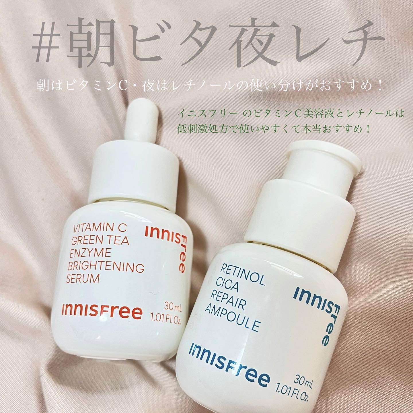 デュアルビタミンC誘導体×グリーンティーエンザイム配合の美容液です。innisfree独自のオイルドロップ処方で、水溶性・油溶性の2種類のビタミンC誘導体の配合を実現👏 やわらかめのジェルのようなテクスチャーで伸びが良く、オレンジ色のカプセルが入っています。肌馴染みも良く、肌に馴染ませた後はベタつきなくもっちりした仕上がりで朝にも使いやすい使用感かと思います! 秋は夏の紫外線などで角質ケアが必要な時期…そんな時にピッタリのビタミンC美容液です!