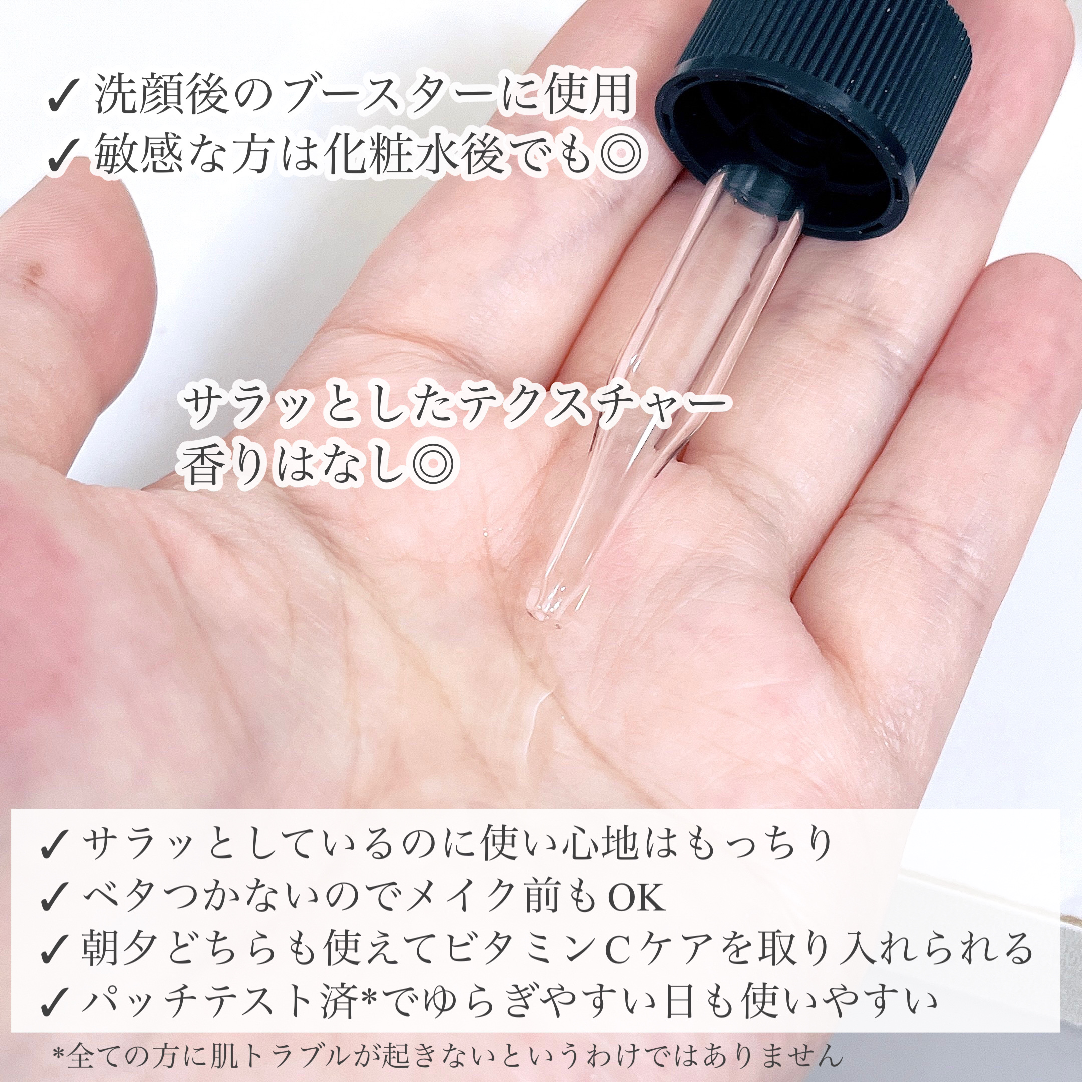 | 匂いも全くと言っていいほどなく、ビタミン系のスキンケアにしてはかなりクセがない商品だと思います。 | 詳細を見る | |