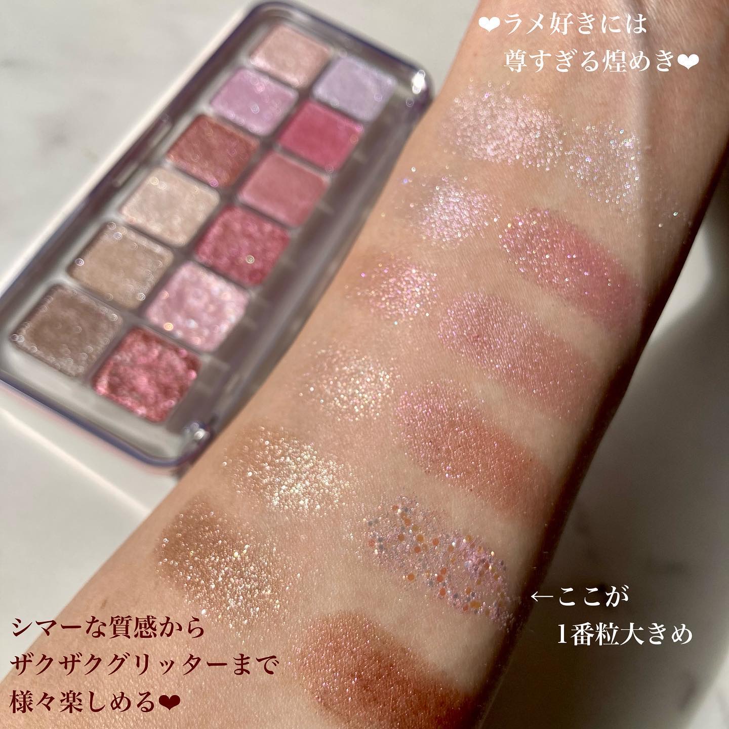 名前にクールとある通り、少しくすみのあるピンクや深みのあるボルドー系の入ったパレット!そして目を惹くピンクベースのカラーにたっぷり入った青ラメ🪄 青ラメは存在感がありますが、ピンクベースなので青ラメだけが浮く感じがなくて、アイシャドウにちゃんと溶け込みつつ煌めいてるのが上品🥹🪄粒の小さい細かいラメなのに煌めくんだよなあ〜素敵🥰 ちなみに同じシリーズのウォームも持っていますが、そちらはコーラル系ピンクで、またラメも上品🥹ウォームも可愛いですよ〜💓