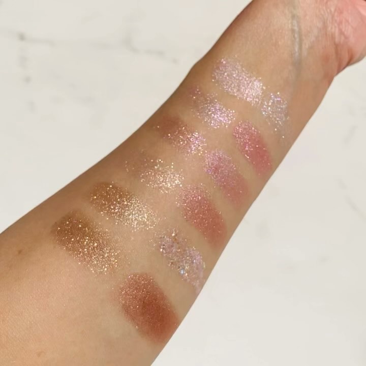 マットは肌に溶け込むような粉質でボソボソしません! シマーのしっとりした粉質も密着してくれて好き!!! 1番キラキラなのは右上のラメですね🍑💓でも粒が大きくないので、大人も使いやすいラメだと思います🥰 どの色使おうか迷うけど、どれ使っても本当可愛くて、自分が桃になったかのような🍑(笑)多幸感あふれるパレットです💘