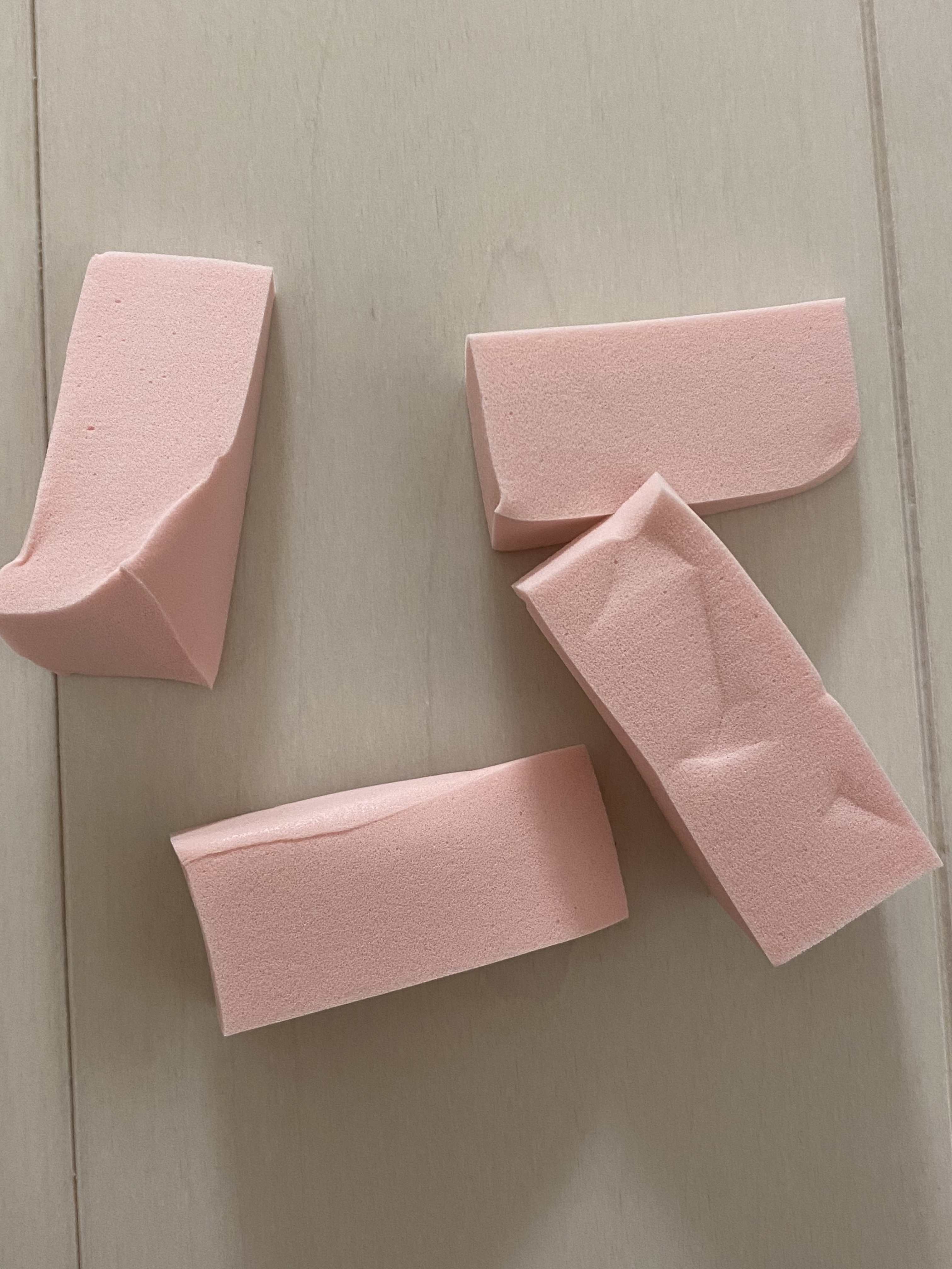 ダイソーのメイクアップスポンジは、茶色のスポンジに変わってて割とショックでした🥲 水に含ませるとより柔らかくなるんだけど、予想以上に柔らかくなる。ふにふにふにゃふにゃなので、ちょっと脆いのかな? ファンデや結構吸う。私のベースメイクスタイルが、多めにファンデを肌に乗せてスポンジで吸わせるっていうスタイルなので、めっちゃ私に合うスポンジだなって思いました🫶