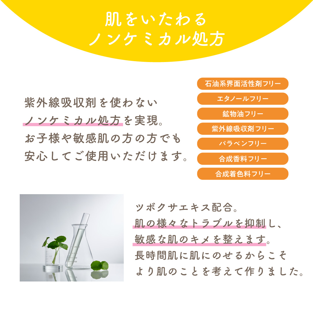 - 【商品特徴】 SPF50+ PA++++(国内最高) UV耐水性★★ 全2色 ホワイト(黄色のパッケージ)/シアーピンク(ピンクのパッケージ) 国内最高レベルの紫外線防御力ながらも、シワ改善&美白効果を兼ね備えた高機能な医薬部外品の日焼け止めミルク。 紫外線をはじめとする外的刺激からお肌を守りながら、有効成分ナイアシンアミドがコラーゲンの生成を促し美白・シワ改善・肌荒れ防止の効果をもたらします。 ●その他主要成分として肌荒れを防ぐCICA、グリチルリチン酸ジカリウム を配合 ●ノンケミカル処方 ●ウォータープルーフ ●6つのフリー エタノール・パラベン・鉱物油・紫外線吸収剤・石油系界面活性剤・合成香料・合成着色料 UVケアは“毎日長時間行う”ということを逆手に取り、長時間肌に乗せることで肌を労わりケアできる優しい日焼け止めを開発しました。日焼け止めの機能は落とさず、紫外線吸収剤は使わないノンケミカル処方を実現。さらに、敏感な肌を整える働きを持つツボクサ由来の成分「CICA(ツボクサエキス)」や、甘草という植物の根から得られる成分を水に溶けやすく加工した「グリチルリチン酸ジカリウム」配合し、敏感な肌を労わり肌荒れを防ぎます。 【使用方法】 1.500円玉大の量を手の甲に出し、額・鼻・両頬・あごの5点に置きます。 2.顔の内側から外側に向かって、指で優しく伸ばします。 3.手のひらで顔を軽く押さえ、肌にしっかりと密着させます。 首や耳、顔まわりの細かな部分も日焼けしやすいので、忘れずに塗りましょう。 効果を保つためには、2〜3時間おきに塗り直すことが大切です。 汗をかいたり、タオルで拭いた場合も、その都度塗り直してください。 ※落とす時は、普段お使いのメイク落としをご使用ください。