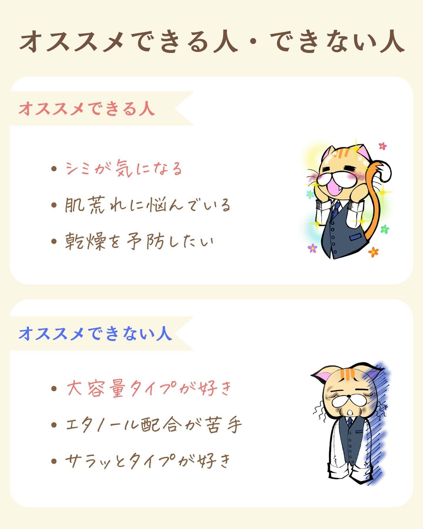 腕に塗布してから30分経過した肌水分量の平均増加率は+87%と優秀すぎる保湿力 サラッとした仕上がり DPG配合 美白有効成分のホワイトトラネキサム酸や、追加された肌荒れ防止有効成分のアラントインが配合 ぬるぬる感は強め 少ししっとりした仕上がりでしっとりタイプの乳液を塗ったような保湿力 有効成分のナイアシンアミドが配合 うるおい成分として3種類のヒアルロン酸が配合