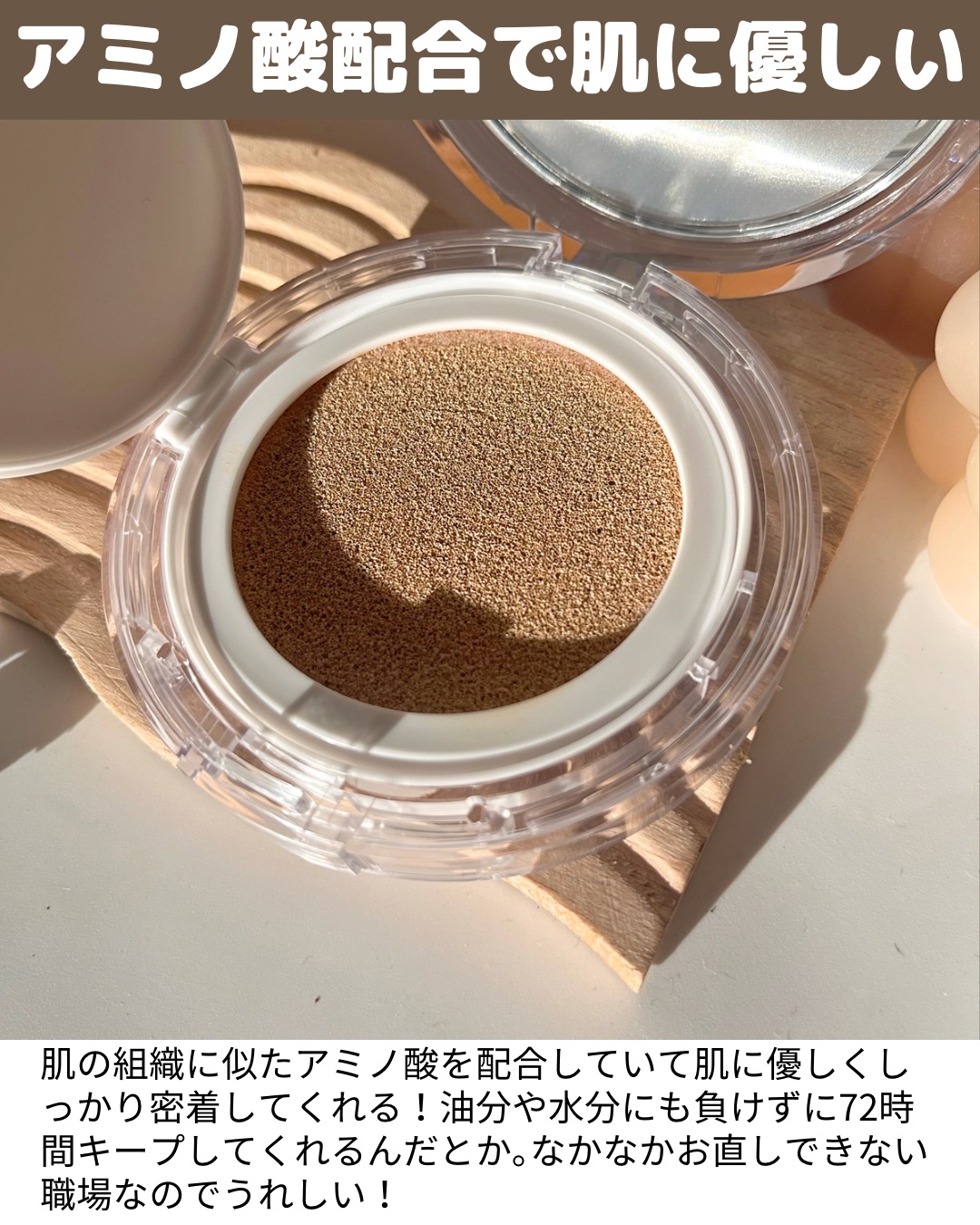 数多くの雑誌やアイドル&芸能人愛用で✨話題になったクッションファンデ✨ カバー力が高く高密着で崩れにも強い。 程よいセミツヤに仕上がり透明感もあるので本当に肌がキレイ♡ 是非使ってほしいクッションファンデです♪ 17種類のアミノ酸コンプレックス配合で 細胞生促進とコラーゲン、エラスチン含有量を増加させて肌の老化防止効果で特許を取得。
