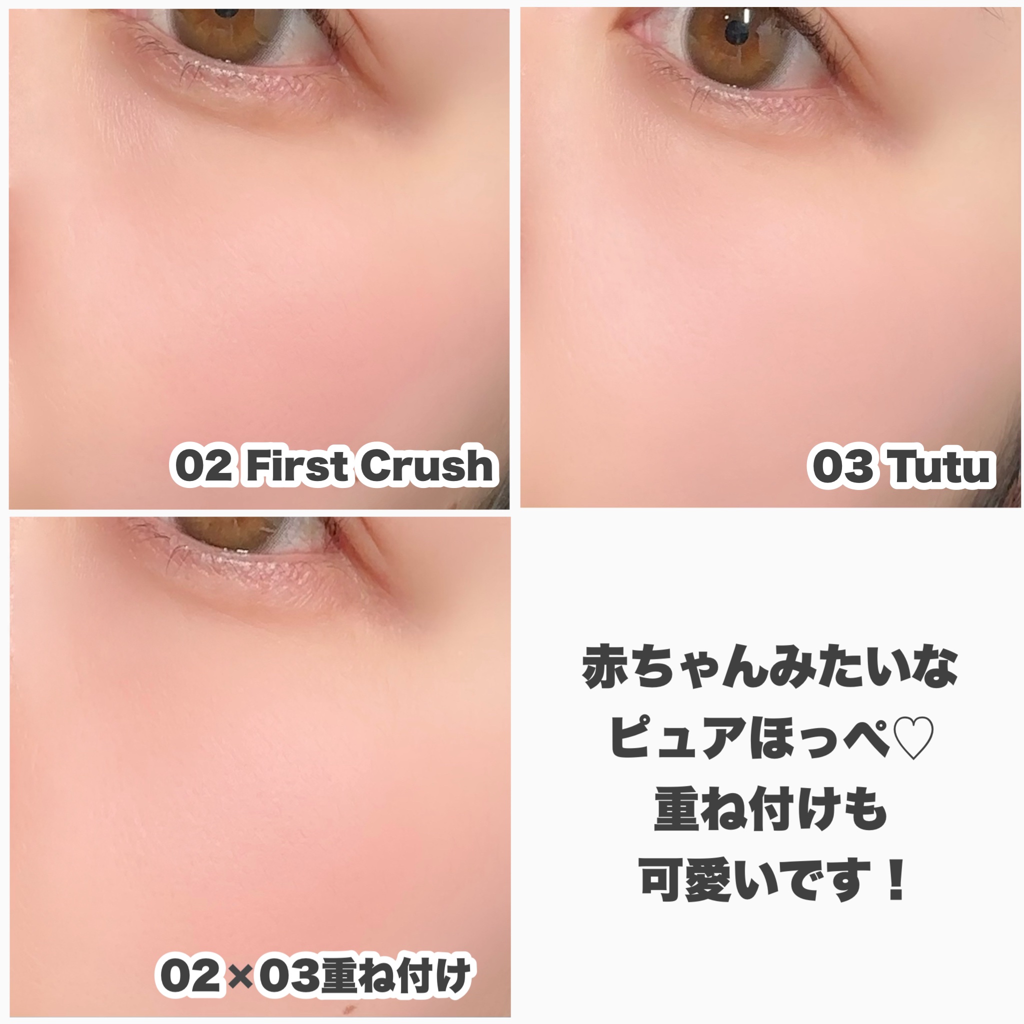 - <01 アプリコットクリーム> タルク、マイカ、ポリメタクリル酸メチル、ステアロイルオキシステアリン酸オクチルドデシル、リンゴ酸ジイソステアリル、トリ(カプリル酸/カプリン酸)グリセリル、ジメチコン、ミリスチン酸イソセチル、ミリスチン酸Mg、1,2-ヘキサンジオール、水添アブラナ種子油、カプリル酸グリセリル、水添レシチン、ステアリルジメチコン、水酸化Al、トリエトキシカプリリルシラン、チャ種子油、ククイノキ種子油、ヒポファエラムノイデス果実油、酸化チタン、酸化鉄、赤226 <02 ファーストクラッシュ> タルク、マイカ、ポリメタクリル酸メチル、ステアロイルオキシステアリン酸オクチルドデシル、リンゴ酸ジイソステアリル、トリ(カプリル酸/カプリン酸)グリセリル、ジメチコン、ミリスチン酸イソセチル、ミリスチン酸Mg、水酸化Al、1,2-ヘキサンジオール、水添アブラナ種子油、カプリル酸グリセリル、水添レシチン、メチコン、トリエトキシカプリリルシラン、チャ種子油、ククイノキ種子油、ヒポファエラムノイデス果実油、酸化チタン、黄4、赤226、酸化鉄 <03 チュチュ> タルク、マイカ、ポリメタクリル酸メチル、ステアロイルオキシステアリン酸オクチルドデシル、リンゴ酸ジイソステアリル、トリ(カプリル酸/カプリン酸)グリセリル、ジメチコン、ミリスチン酸イソセチル、ミリスチン酸Mg、1,2-ヘキサンジオール、水添アブラナ種子油、カプリル酸グリセリル、水酸化Al、水添レシチン、カオリン、メチコン、トリエトキシカプリリルシラン、チャ種子油、ククイノキ種子油、ヒポファエラムノイデス果実油、グンジョウ、酸化チタン、黄4、赤226、酸化鉄 <04 チャイルドライク> タルク、マイカ、ポリメタクリル酸メチル、ステアロイルオキシステアリン酸オクチルドデシル、リンゴ酸ジイソステアリル、トリ(カプリル酸/カプリン酸)グリセリル、ジメチコン、ミリスチン酸イソセチル、ミリスチン酸Mg、1,2-ヘキサンジオール、水添アブラナ種子油、水酸化Al、カプリル酸グリセリル、水添レシチン、メチコン、チャ種子油、ククイノキ種子油、ヒポファエラムノイデス果実油、トリエトキシカプリリルシラン、酸化チタン、赤226、グンジョウ、黄4、酸化鉄 <05 カミングアップローズ> タルク、マイカ、ポリメタクリル酸メチル、ステアロイルオキシステアリン酸オクチルドデシル、リンゴ酸ジイソステアリル、トリ(カプリル酸/カプリン酸)グリセリル、ジメチコン、ミリスチン酸イソセチル、ミリスチン酸Mg、1,2-ヘキサンジオール、水添アブラナ種子油、カプリル酸グリセリル、水添レシチン、水酸化Al、メチコン、チャ種子油、ククイノキ種子油、ヒポファエラムノイデス果実油、トリエトキシカプリリルシラン、酸化チタン、赤202、赤226、酸化鉄