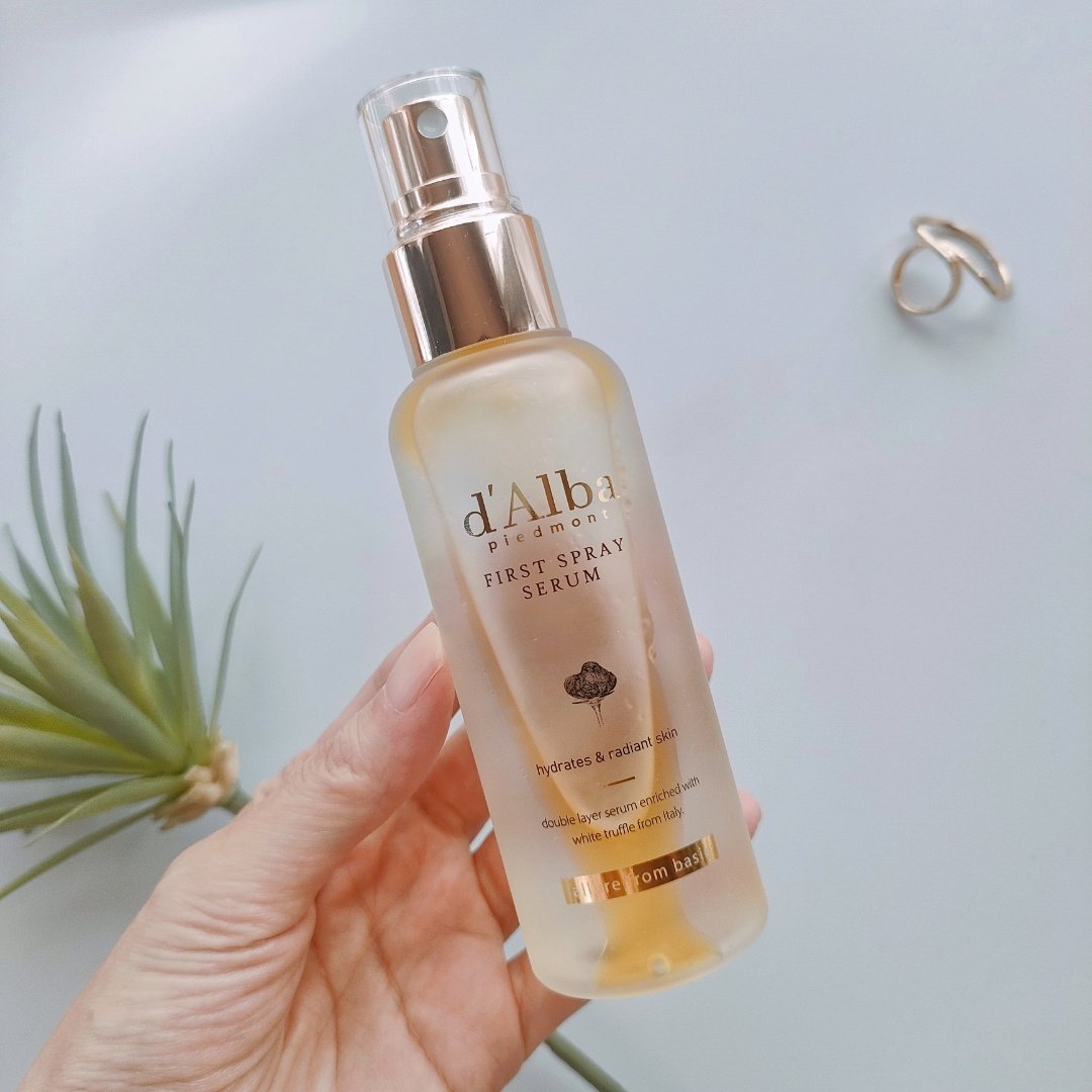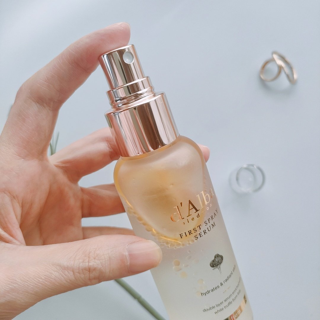 高級感のある透明のボトルからは中が2層になっているのがよく見えます。上の方が黄色く、下は透明です。 イタリア産ホワイトトリュフが入っているセラムです。オイルの層はボトルを振るとすぐに混ざります。 シュッシュッとお肌にかけてふんわりいい香りを楽しみます。とってもいい香りがするんですよ。