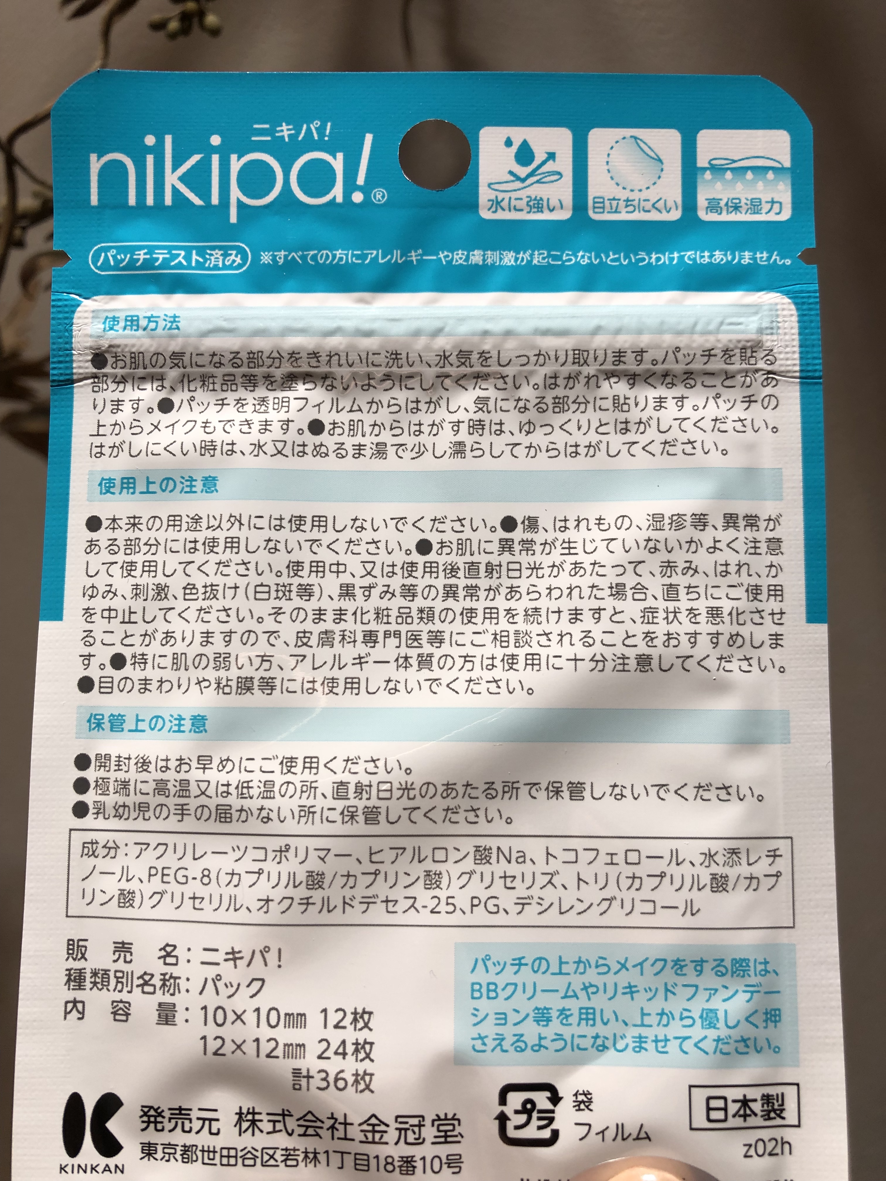 上からメイクできる、薄さ0.05mmの極薄透明パッチ「ニキパ!プレミアム」をご提供いただきました。たくさんの保湿美容成分が入っているので、気になる方は画像の箱裏をご覧ください。使い方は簡単。肌を清潔にした後しっかり水分を拭き取り、気になるとこ...